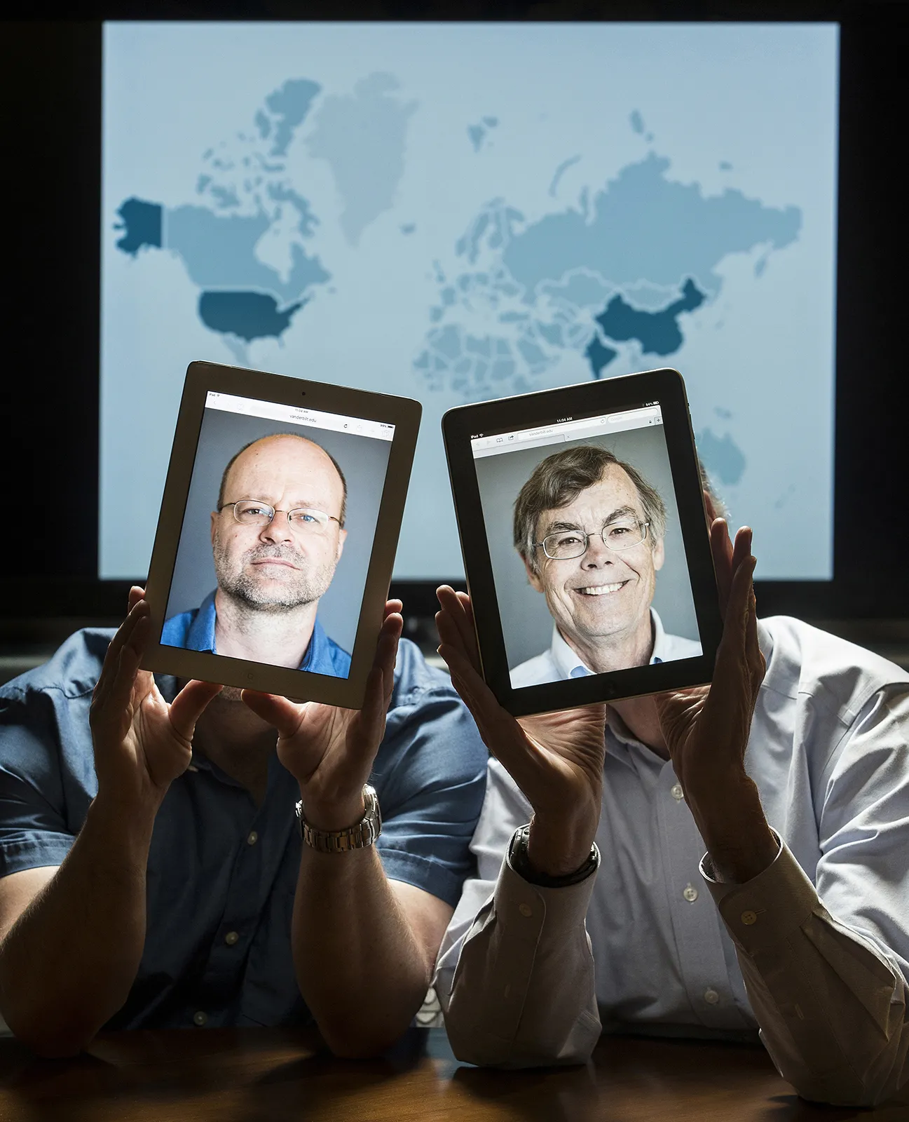 This environmental portrait of professors Akos Ledeczi and Michael Fitzpatrick will accompany a Magazine feature article about their success in teaching online MOOC courses for students all over the world.