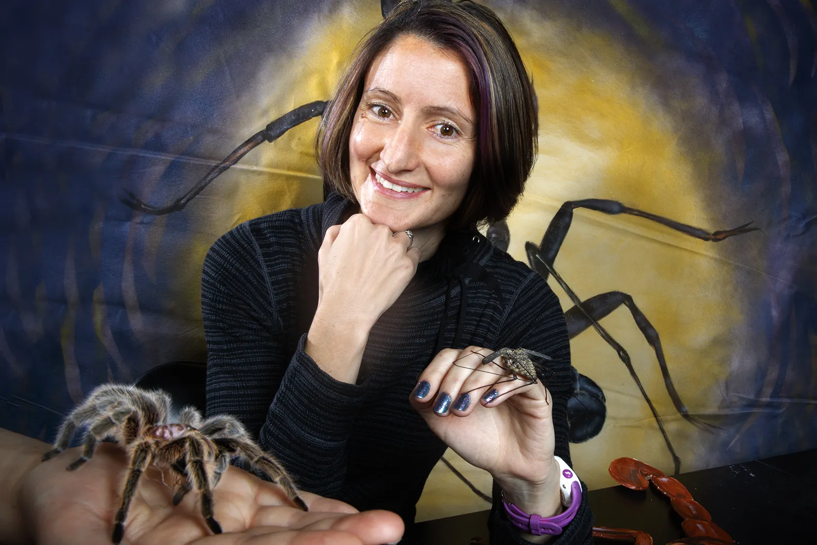 Eileen Hebets won a system-wide teaching award for her work with spiders. So she and a couple friends posed for a portrait. No spiders or photographers were injured in the photo shoot.