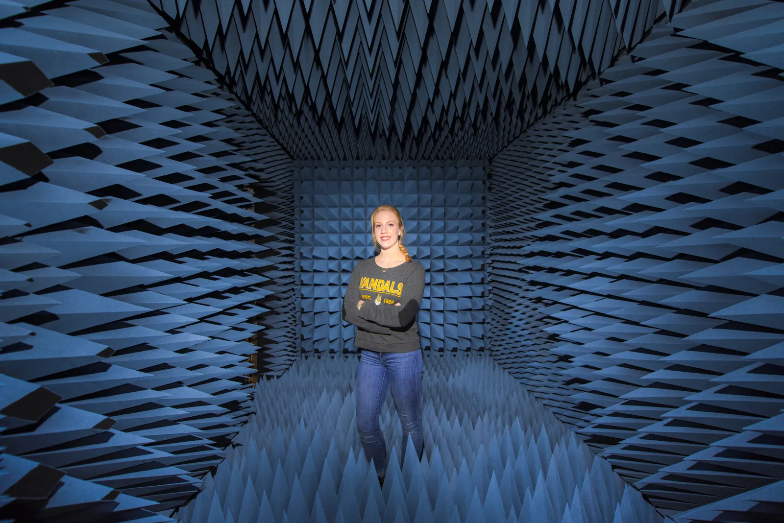 Graduation feature of an engineering student working with sound waves in her undergrad test site.
