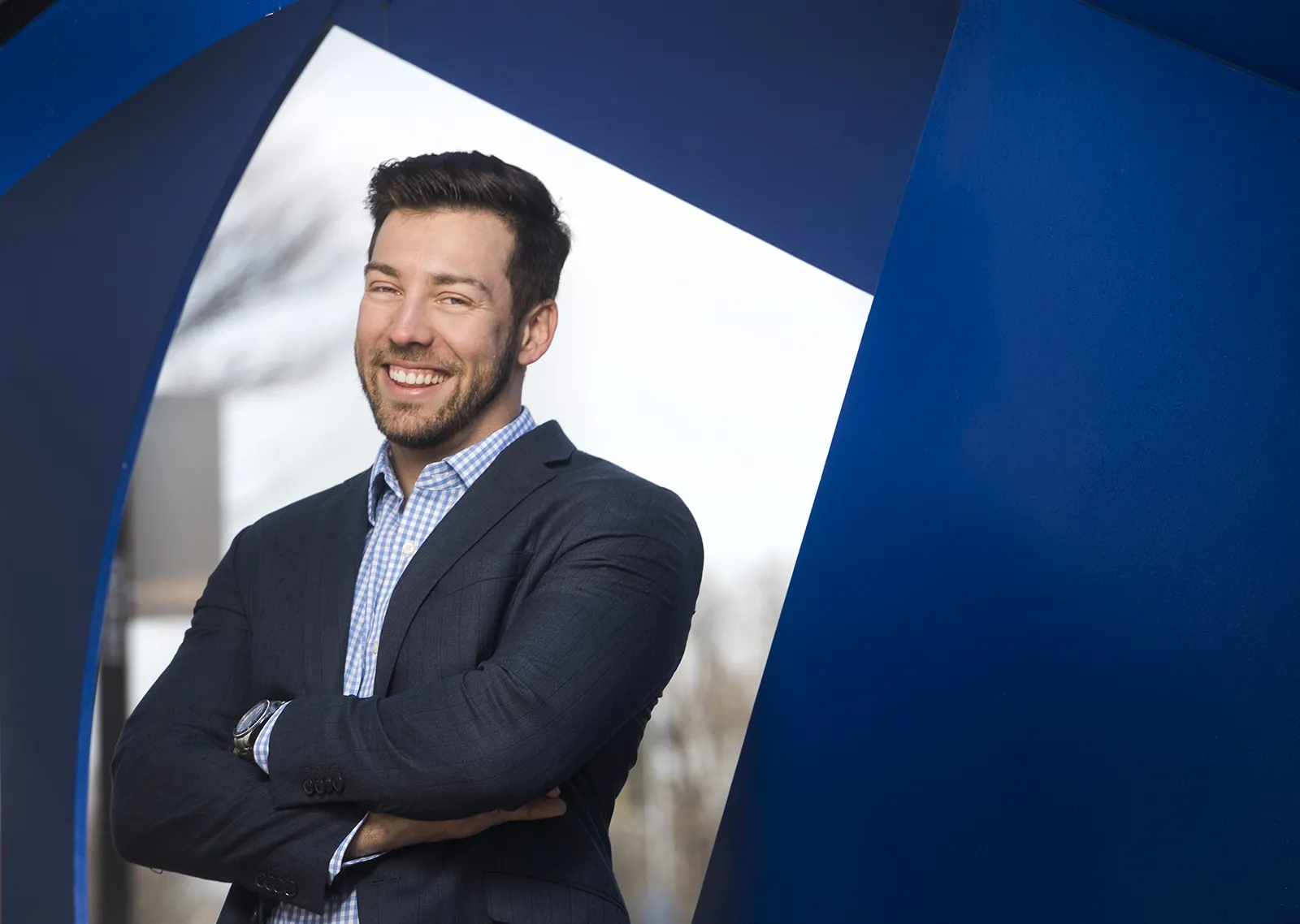 Artem Trotsyuk, Social Media Coordinator for Strategic Communications at UC Davis photographed near Fletcher Benton's Alphabet D on January 25, 2017.