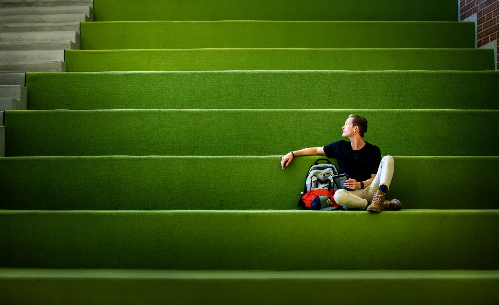 Student sits on the green steps in the Student Life and Wellness Building for a recruitment photo shoot.