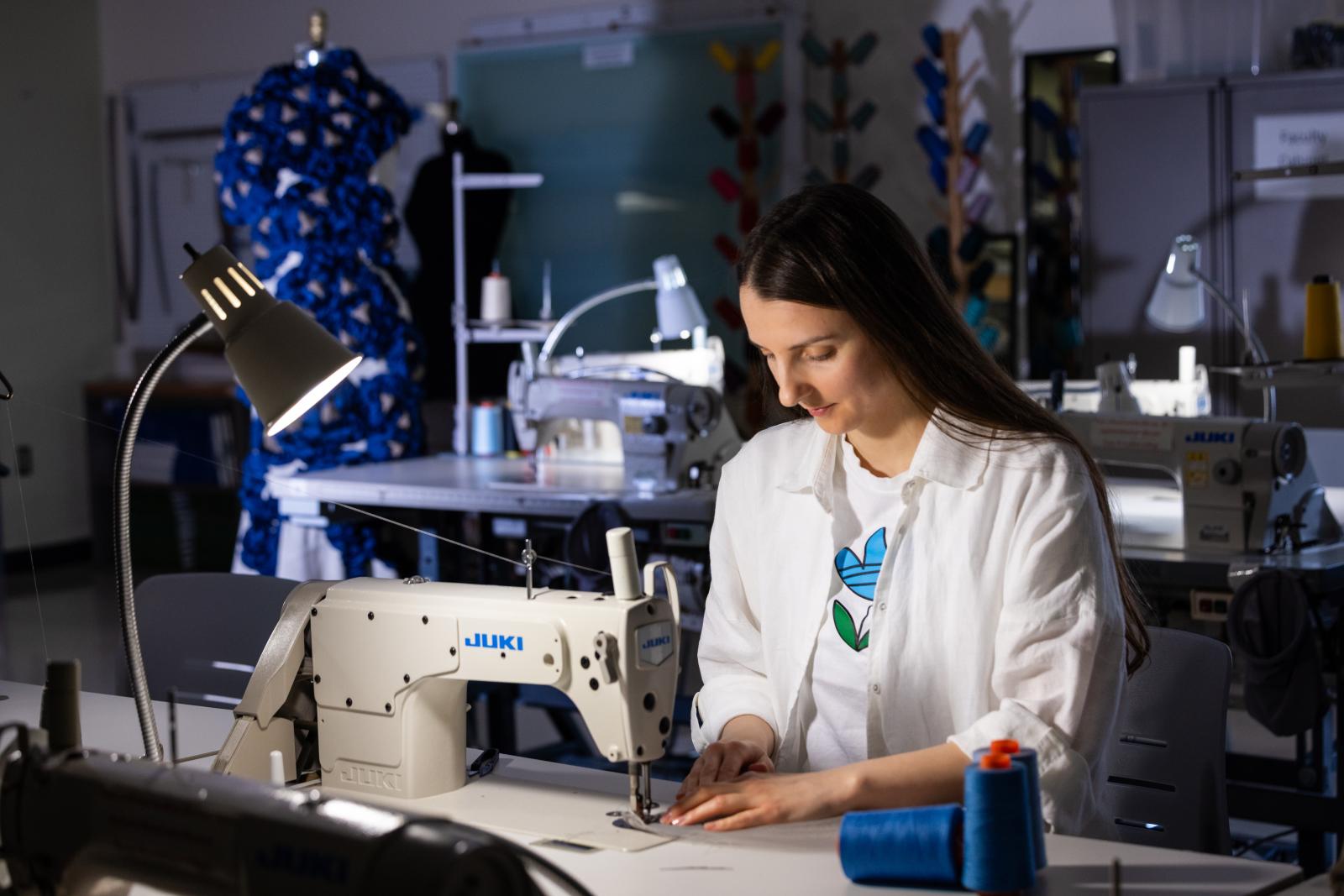 Kat, a Harper Fashion Studies student, puts the finishing touches on her ballroom gown for jury selection.