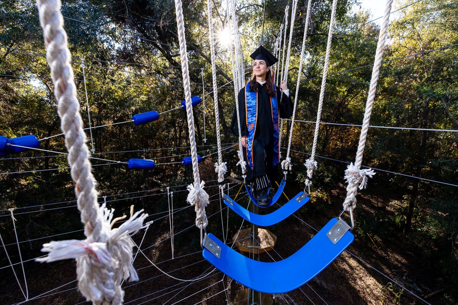 University of Florida senior Maria Jose Cespedes poses for a commencement-themed portrait at the Lake Wauburg Challenge Course on Wednesday, December 4, 2024.
