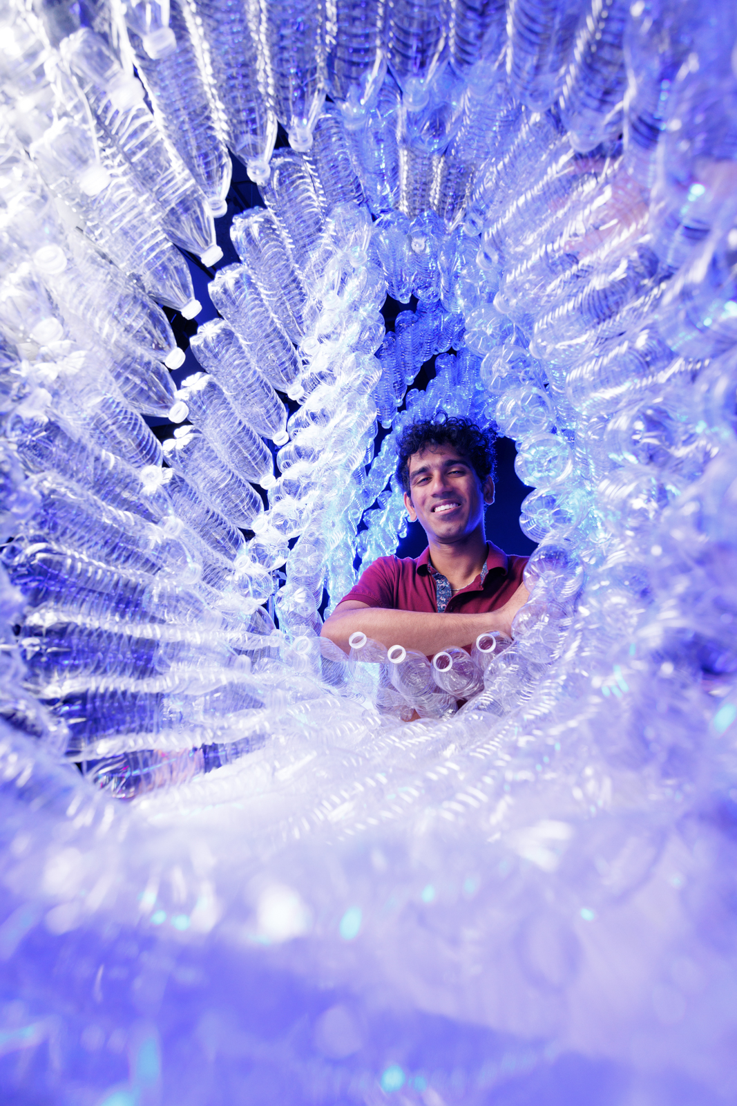 This graduate student is working to find better engineering solutions to recycling plastics. He is pictured here on a set hand-made with water bottles. Note: AI was used to clean up the hand-made set of water bottles.