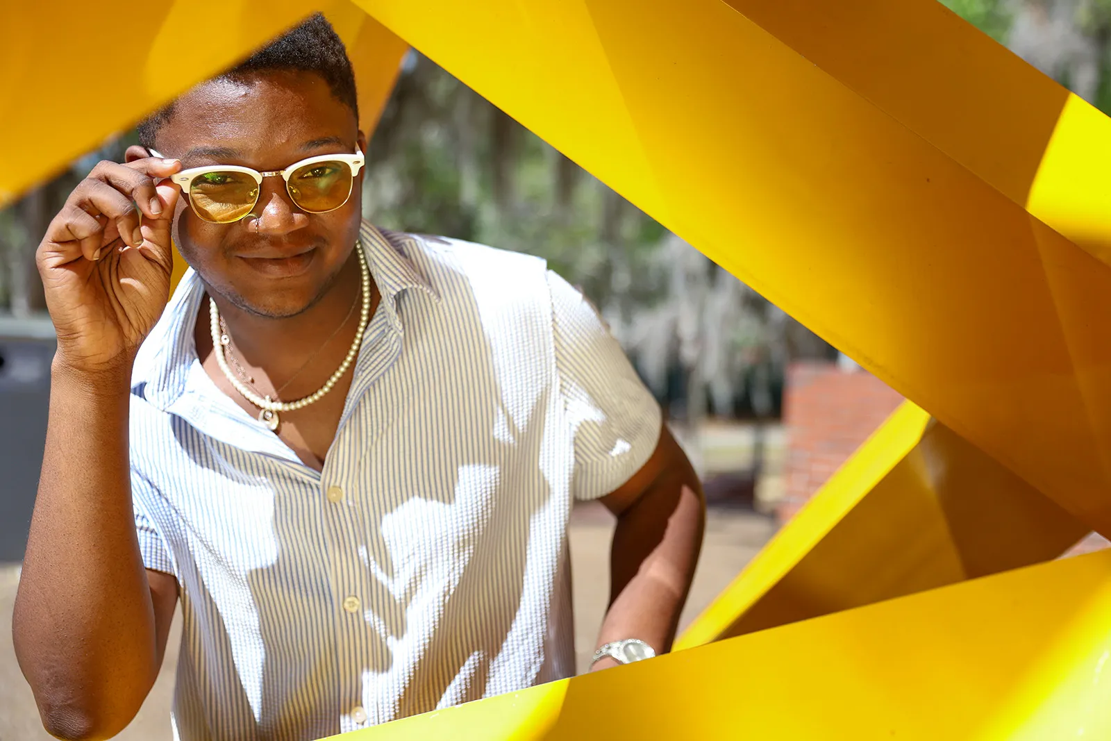 Jonathan Stephens, Student Circulation Supervisor at Marston Science Library, poses in the famous French fries statue. After graduation, Jonathan plans to work in government relations with a national firm, focusing on supporting food and agricultural clients. This portrait is included in the Smathers Libraries centennial project, “Humans of the Libraries,” to recognize the graduating class of 2025 library student employees.