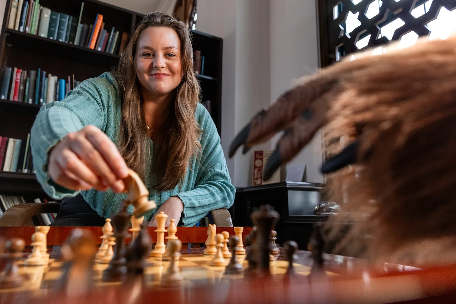 Ashleigh Lucas plays chess against the University of Florida Libraries SASCwatch. Lucas, a former intern of the Libraries communications team, spent her junior summer interviewing Special & Area Studies Collections (SASC) curators dressed as a sasquatch. These videos were part of an initiative to make special collections more approachable. This portrait is included in the Smathers Libraries centennial project, “Humans of the Libraries,” to recognize our graduating class of 2025 library student employees.