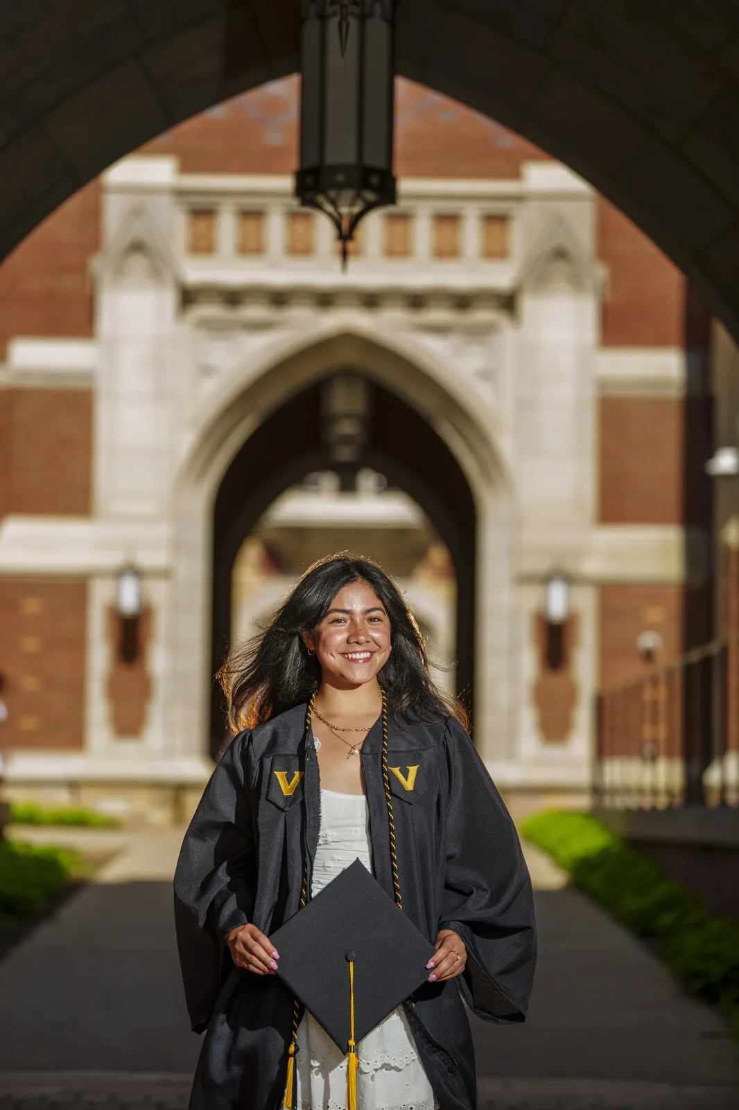 Alondra Sandovall poses for a senior portrait in her residential college.