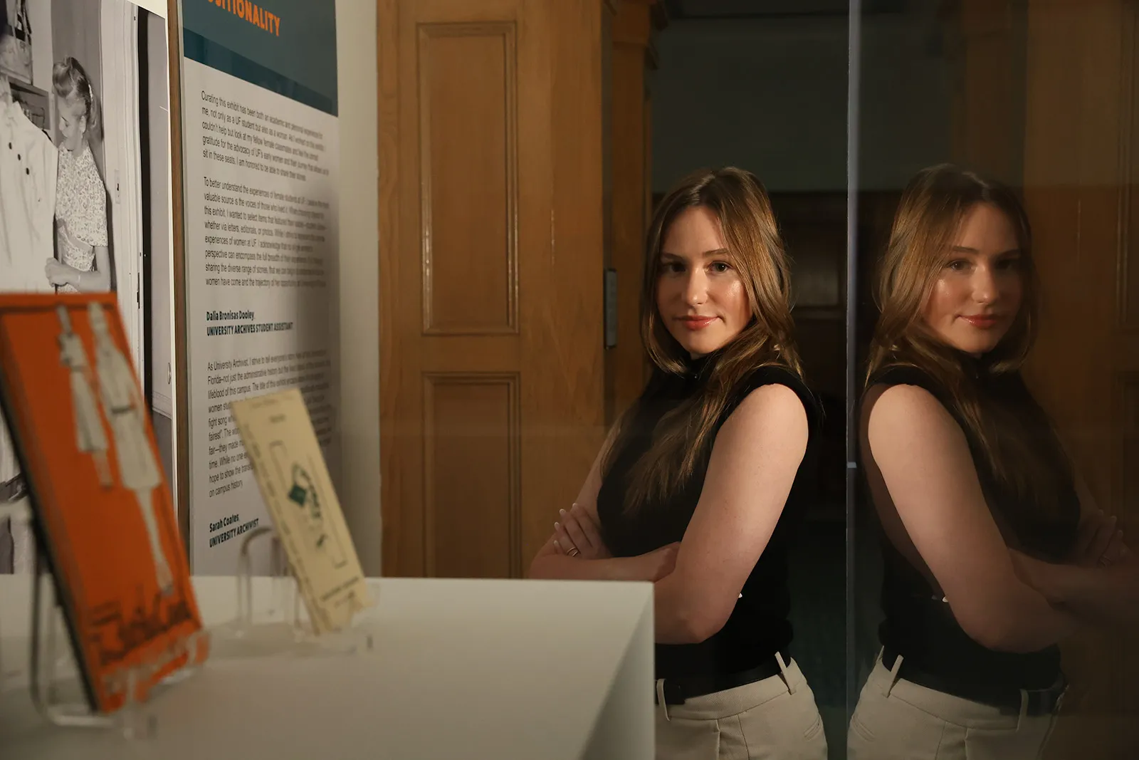 Dalia Dooley, student assistant to the University Archivist, poses in an exhibition she curated, along with Sarah Coates, the University Archivist. The exhibit, “We Are the Girls of Old Florida,” follows the stories of the first women at UF and highlights the struggles they overcame entering a male-only campus. This portrait is included in the Smathers Libraries centennial project, “Humans of the Libraries,” to recognize the graduating class of 2025 library student employees.
