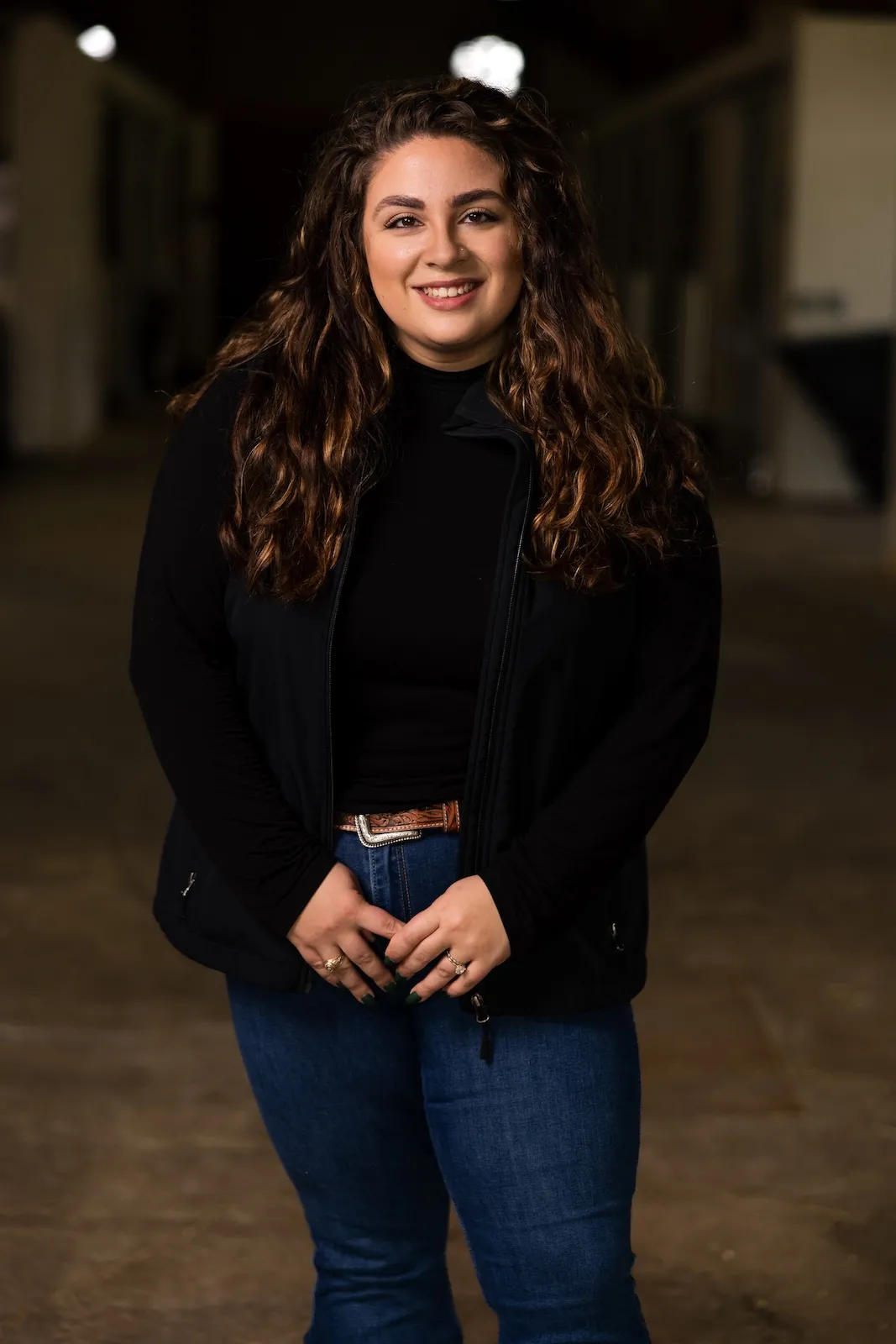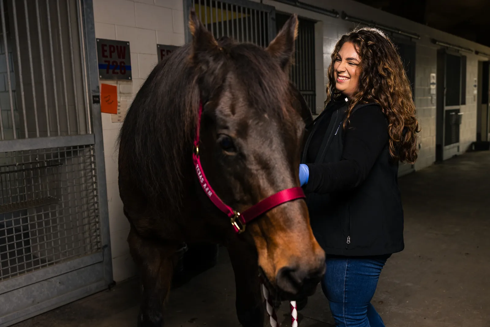Portrait of an equine scholarship recipient taken in a barn with horse stalls.