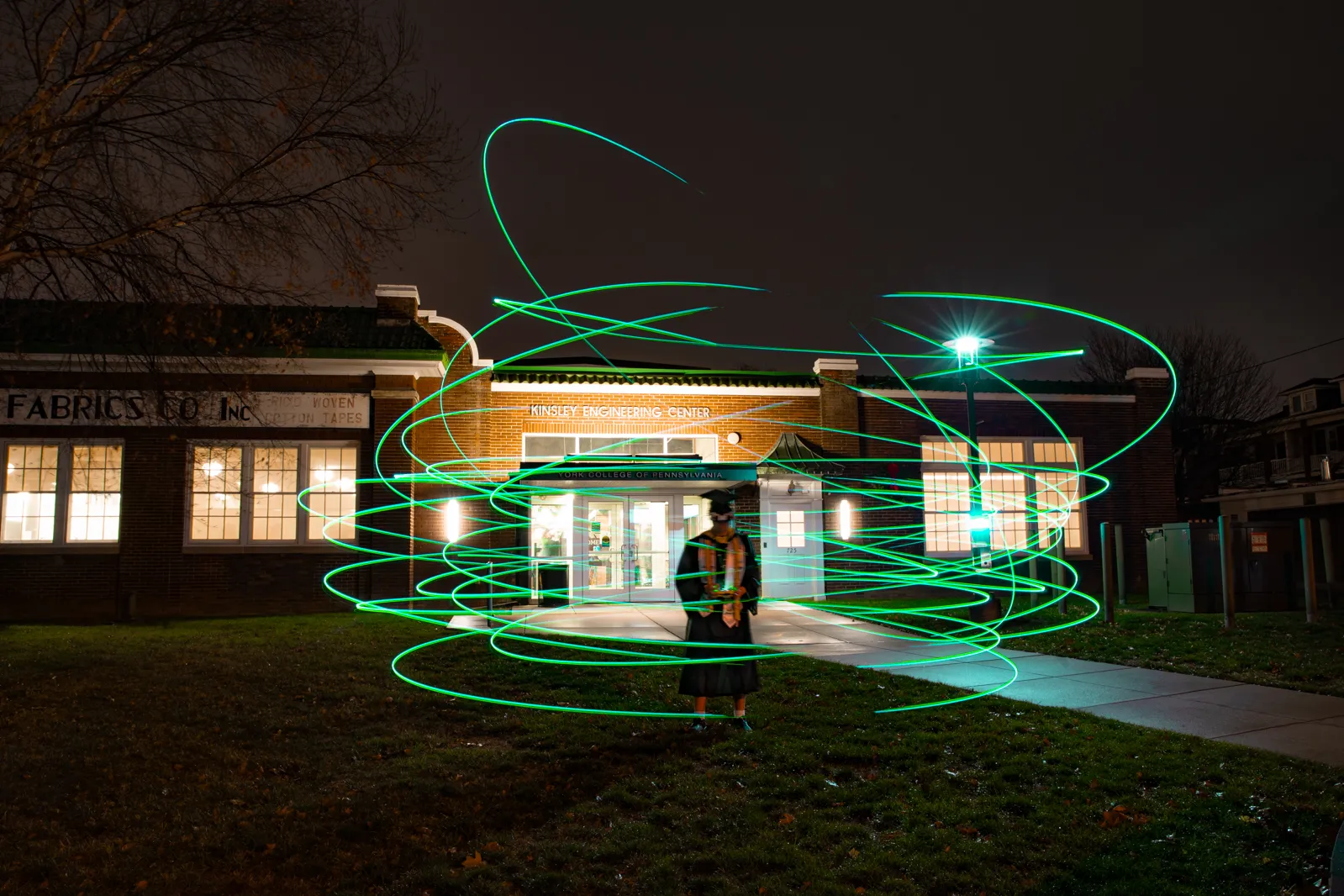 Alex Suarez ’24 took third place in the 2022 Collegiate Drone Racing Championship, fourth place in 2023, and third place again in 2024. The first to graduate from York College of Pennsylvania with a double major in Electrical Engineering and Mechanical Engineering, Alex is an incredibly hard working and talented individual. When asked if we could feature him on our institutional social media channels to celebrate his accomplishments, Alex asked if we could try a photo different to the normal smiling portrait. Turning his drone lights to YCP green, Alex raced his drone around himself during a long exposure to show just how he feels immersed in his goggles. Alex is heading to the University of Alaska Fairbanks, where he will pursue a master’s degree in Mechanical Engineering and research drone technology.
