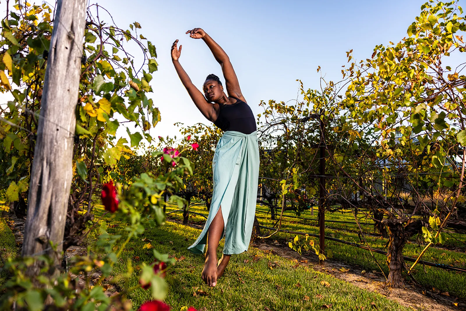 A Performance Visualization and Fine Arts dance science student poses in the Gardens at Texas A&M University on Tuesday, Nov. 19, 2024, in College Station, Texas. (Abbey Santoro /Texas A&M University Division of Marketing & Communications)