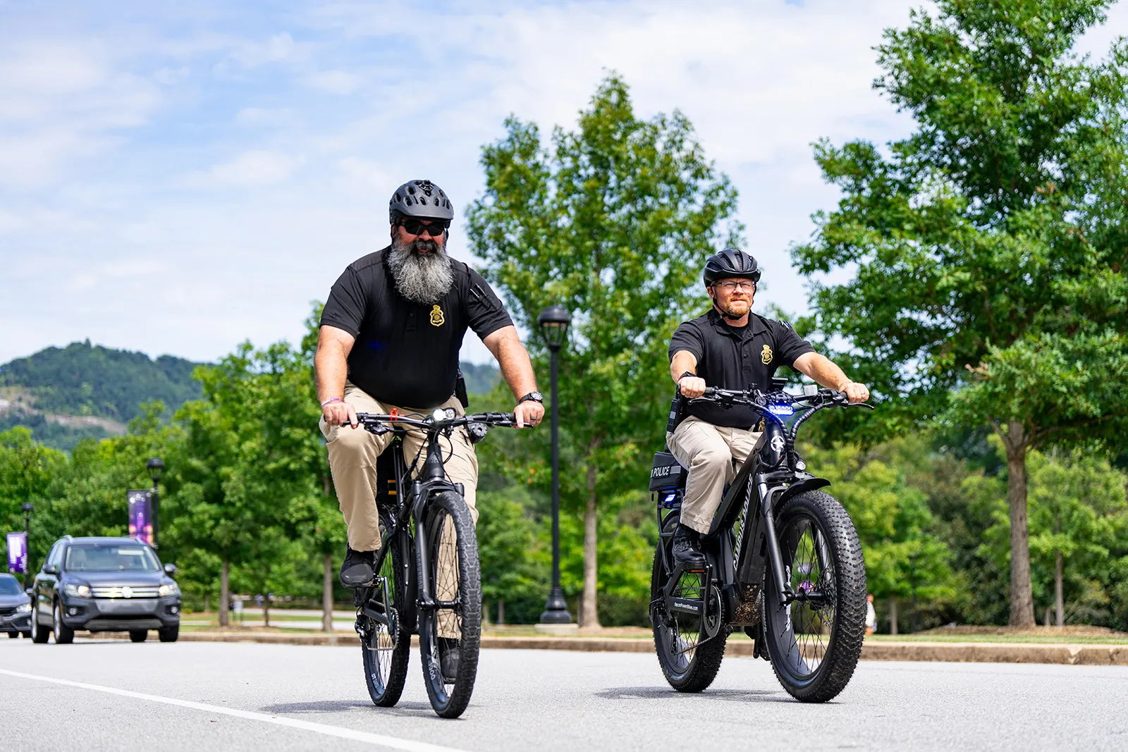 Mark and Gator, two Furman University Police Officers, patrol campus on their new bicycles.