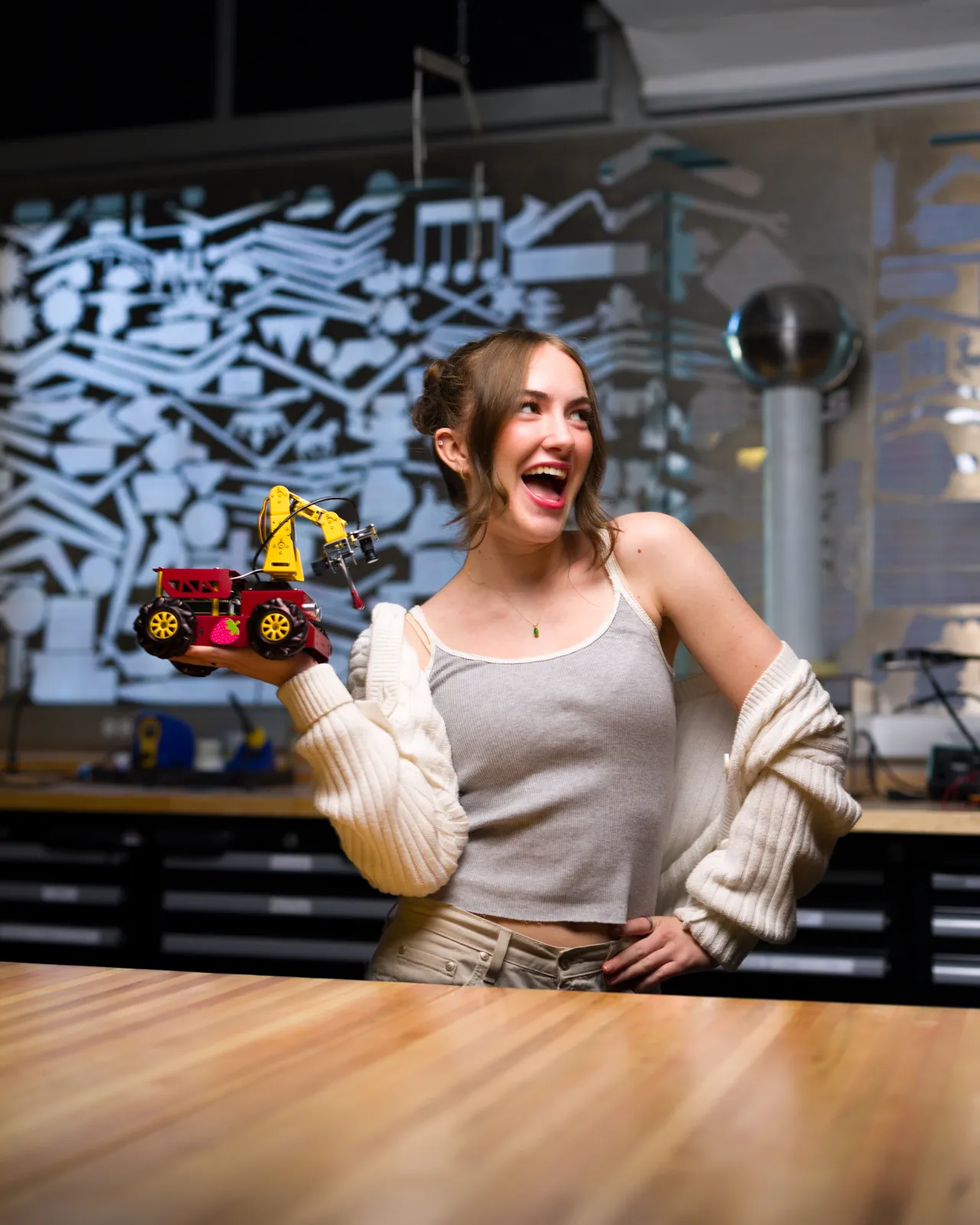 Engineering student Ellen Halbur poses with her creation, the robot "Cyberry Shortcake."