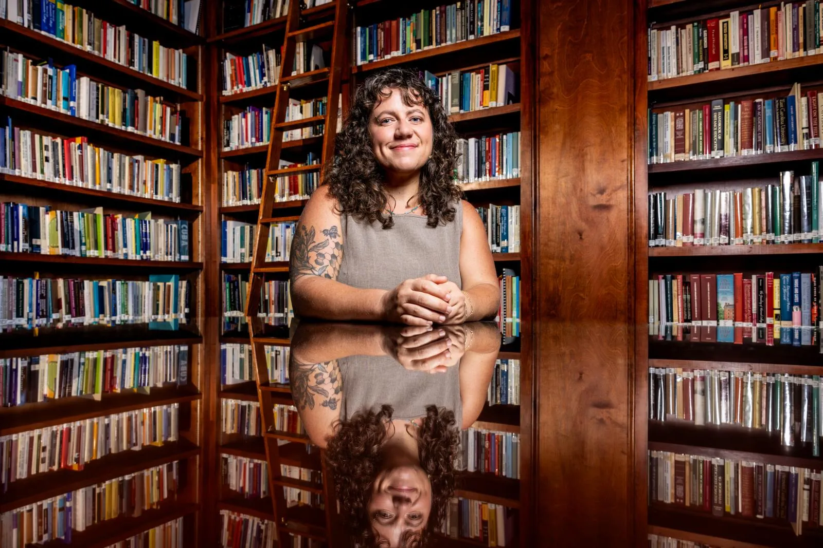Portrait of graduate student Julianne O'Connell in the Fincher Library at Meigs Hall.