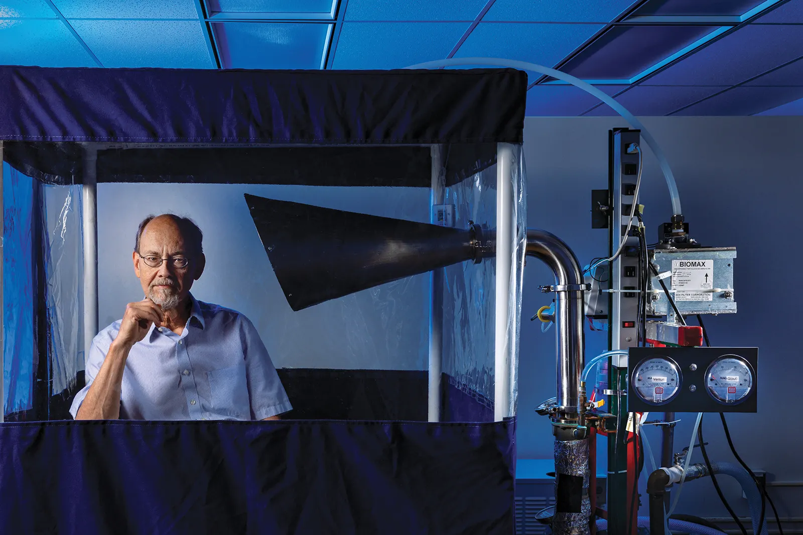Each year, according to the World Health Organization, seasonal influenza respiratory infections kill up to 650,000 people; while science has pinned down much of the biology of flu and other dangerous viruses, it hasn’t yet provided a precise account of how they’re passed from person to person to cause illness—or clear answers about preventing their spread. To prove his point about what’s in the air, Milton developed a machine, which he named Gesundheit II; the vaguely steampunk assemblage of tubes and gauges leads to a Victrola-like horn into which visitors to his Public Health AeroBiology Laboratory stick their faces so the machine can capture their breaths and extract viruses. In a 2013 study published in PloS Pathogens, he used it to demonstrate flu virus could be captured from infected people’s breath and cultivated