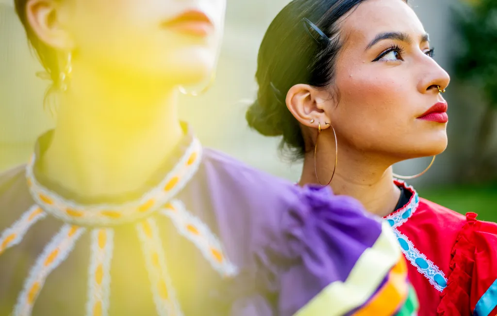 Josilynn Hradowsky, left, and Giselle Torres dance with Monarcas, a GVSU student organization that performs traditional folkloric dances to showcase and appreciate Mexican culture.