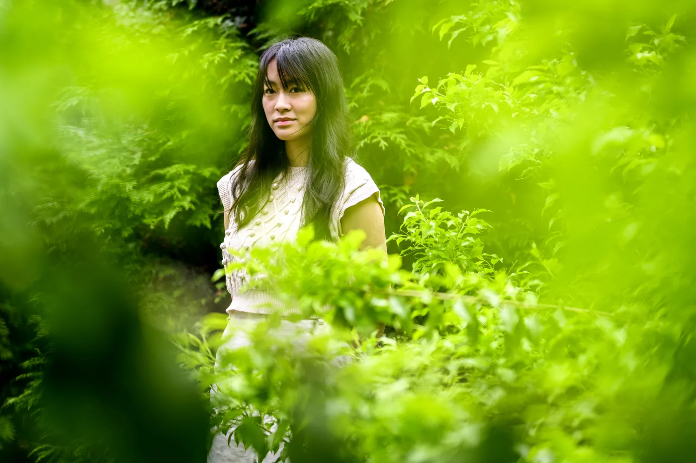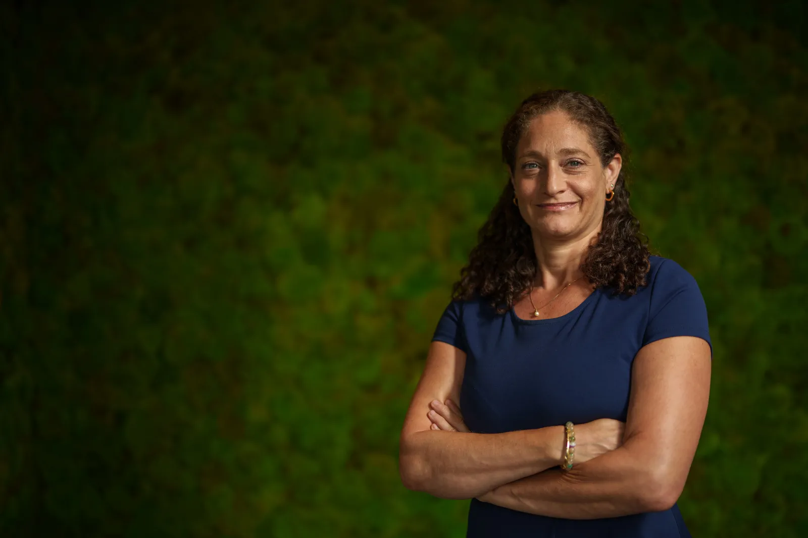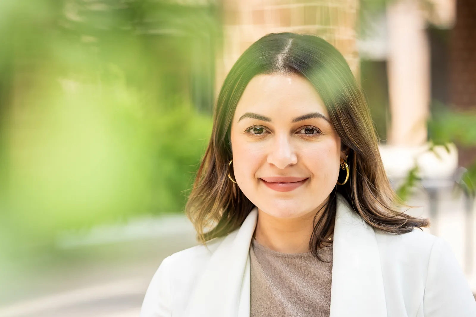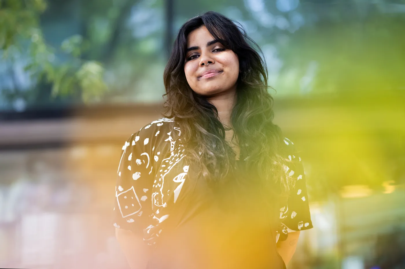 A portrait of Farina Barth, a faculty member in the School of Law, taken in Paula’s Plaza outside O’Brian Hall in July 2024.