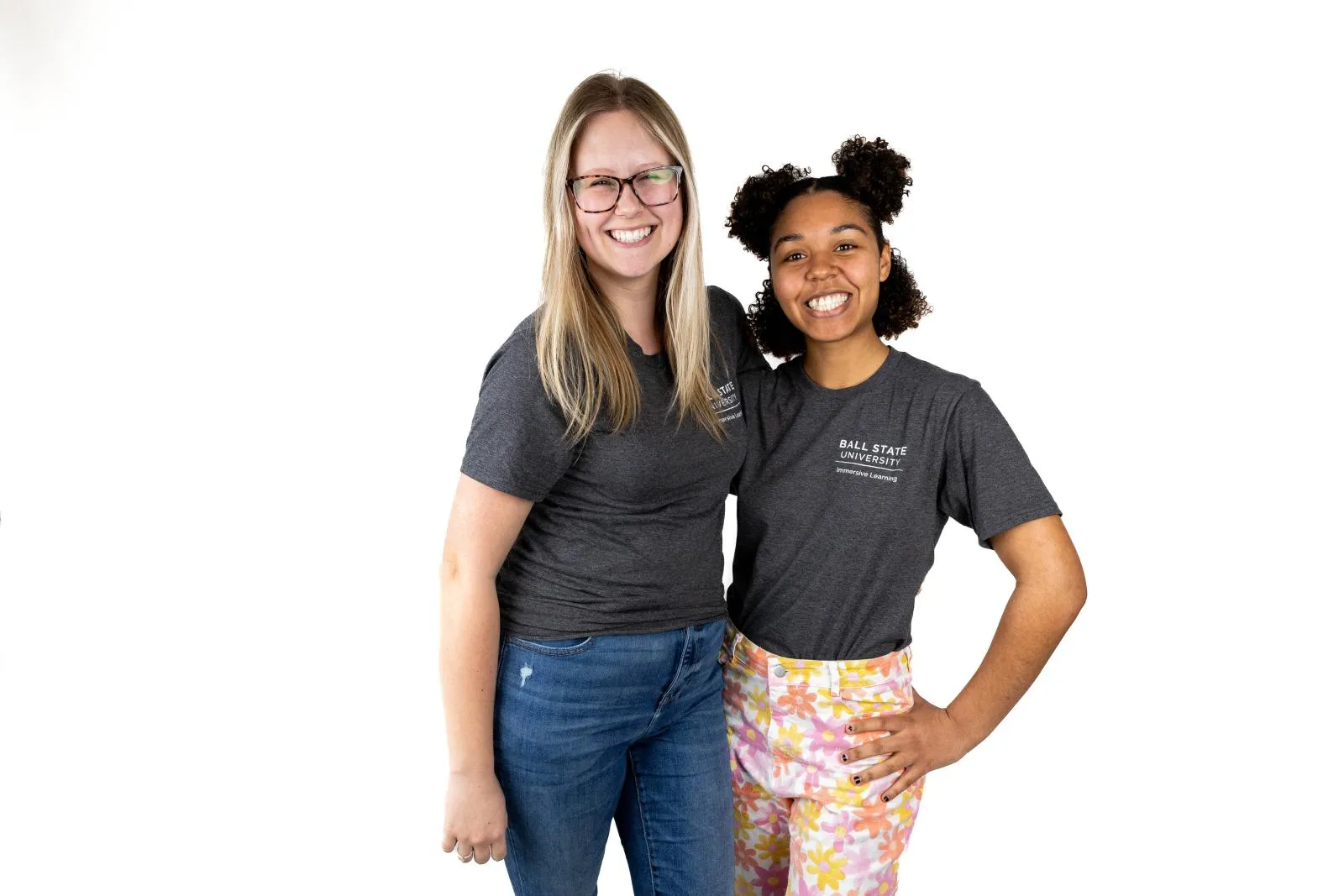 Student workers in the Ball State Office of Immersive Learning pose for a portrait in the studio to hang on the office wall as they prepare to graduate.