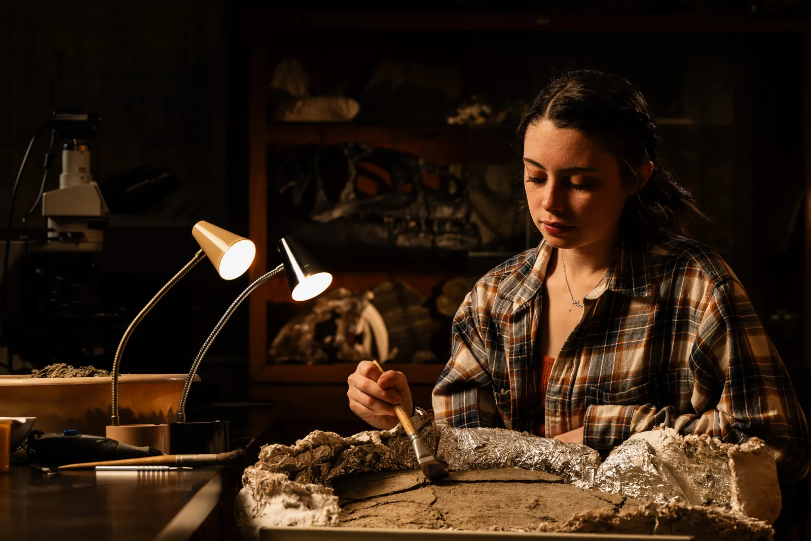 Emma Puetz, a master’s student in geology and geophysics, works on and prepares the first triceratops fossil she found. She has now found two seperate triceratops fossils in Montana’s rocky terrain during summer field programs. Puetz’s next academic stop will be Johns Hopkins School of Medicine, where she will be a Ph.D. student in functional anatomy and evolution and continue studying dinosaur brains.