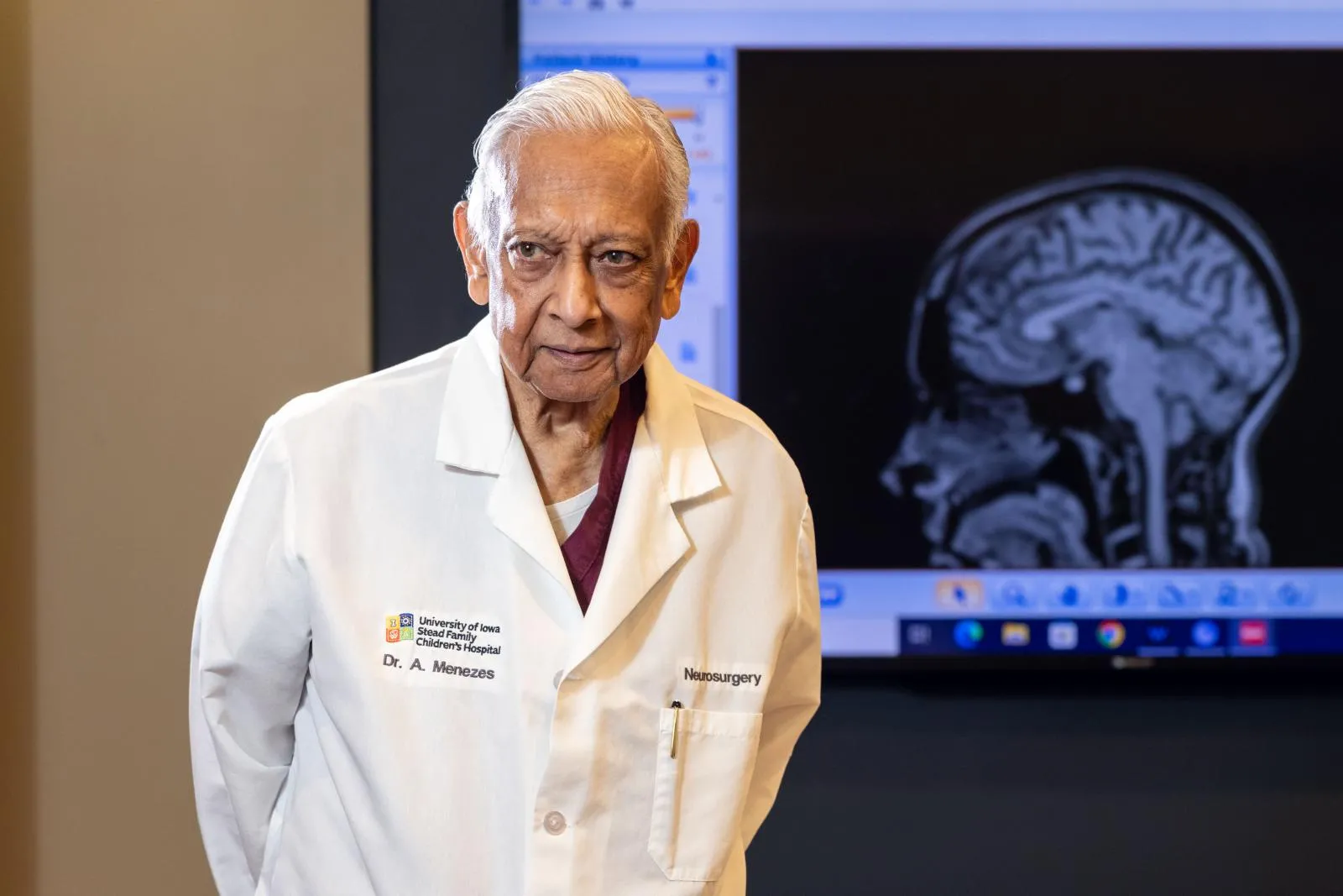 Dr. Arnold Menezes on Friday, March 29, 2024. In 2024, Menezes marks 50 years at Iowa as one of the world’s top experts in surgical approaches of the craniocervical junction—the area where the skull meets the spine.