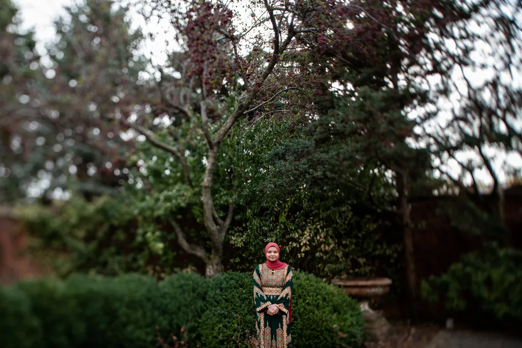 Aseel Ayesh is a senior double majoring in accounting and finance. Aseel, dressed in her cultural thobe, is a Niemeyer Award recipient. Ayesh is also working on Palestinian embroidery known as tatreez.