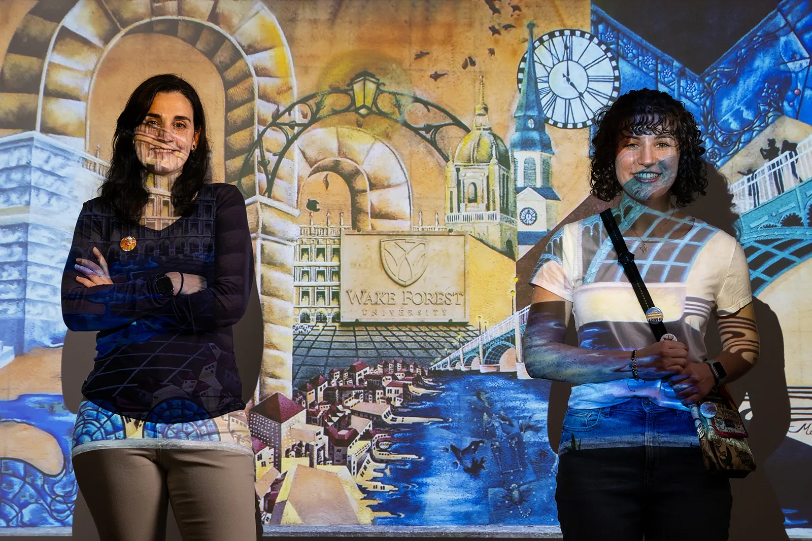 Spanish Prof. Sara and Spanish and Sociology double major Anna pose a photo together in front of a projected image of a mural in Spain. Anna studied abroad last summer in Spain.