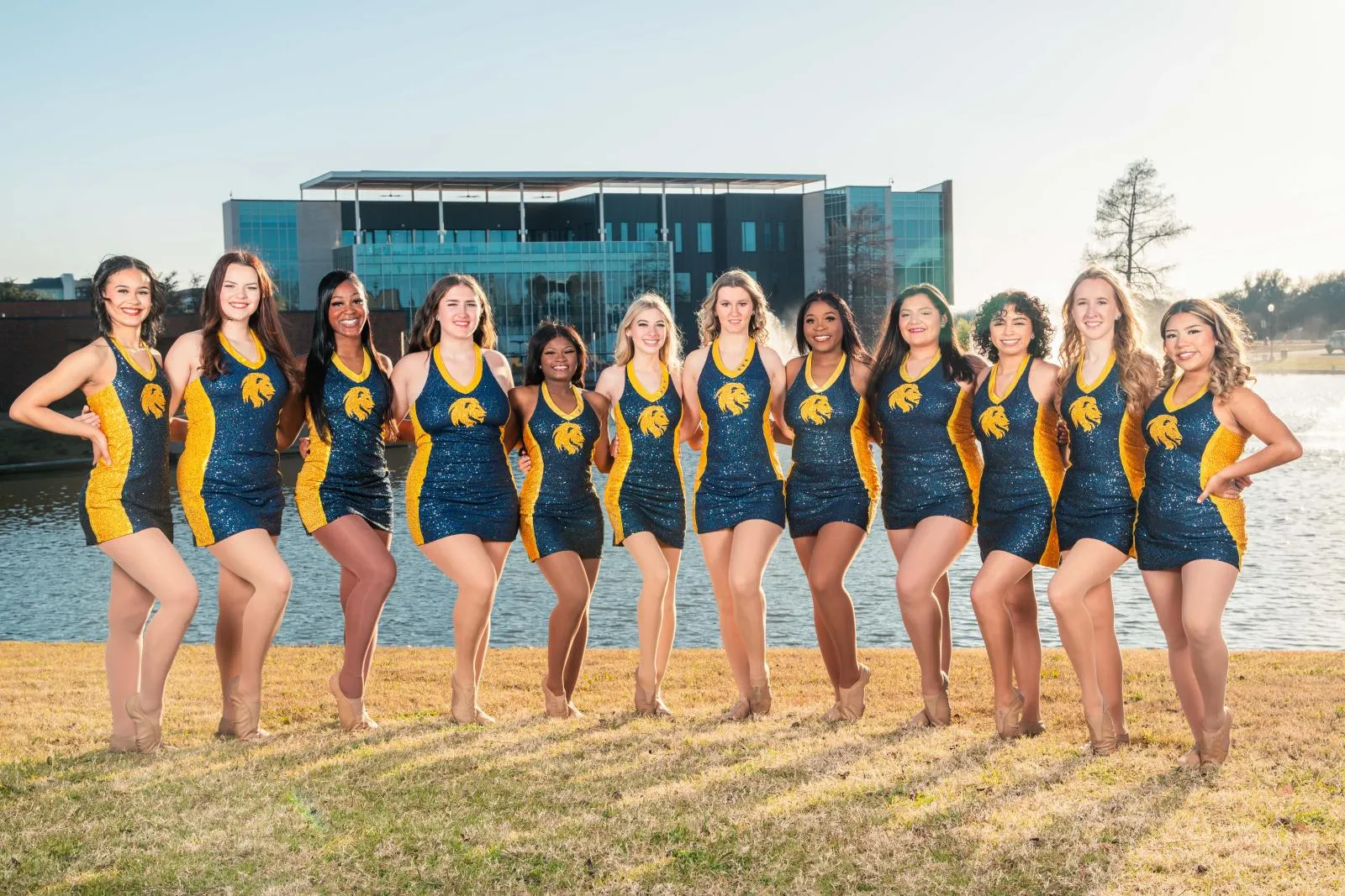 Texas A&M University Commerce Lions Dance Team, shot by Tyler Holloway. The shoot consisted of individual portraits and this group photo in front of A&M Commerce's Nursing Building and Garvin Lake. Two-point lighting with the Sun as the rim light.