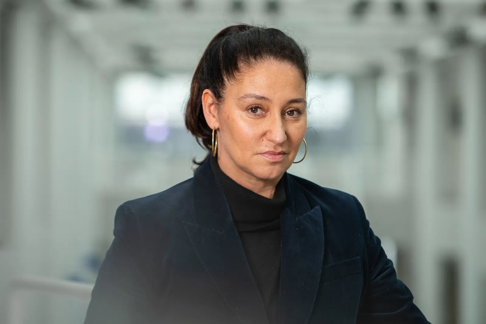 A portrait of Kyla Tompkins, chair of the department of global gender and sexuality studies, photographed in the Center for the Arts in January 2024.