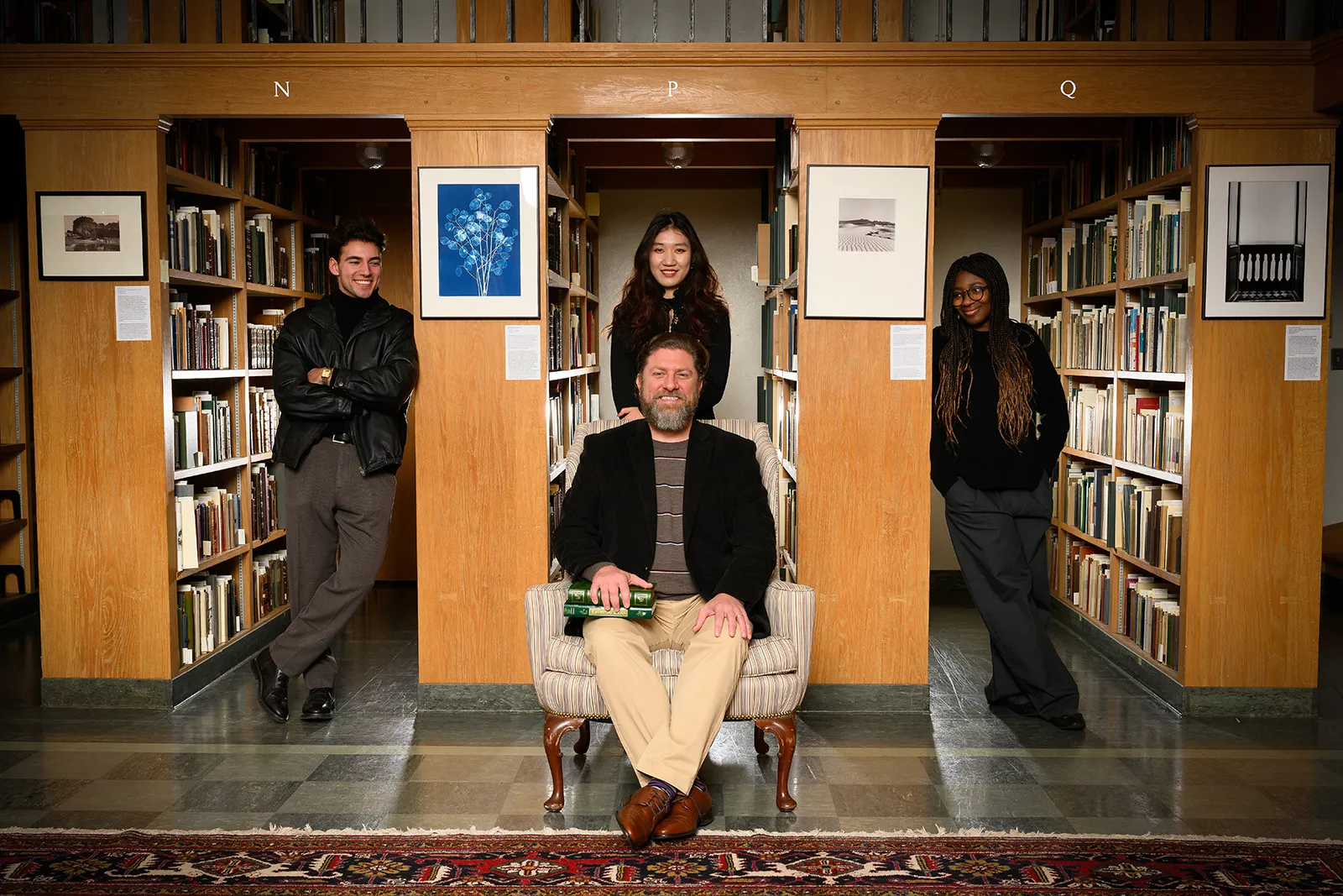 Prof. Greene, Logan, Youlin, and Yeanaba pose for a photo together at Special Collections. The group is doing research together on classic American literature.