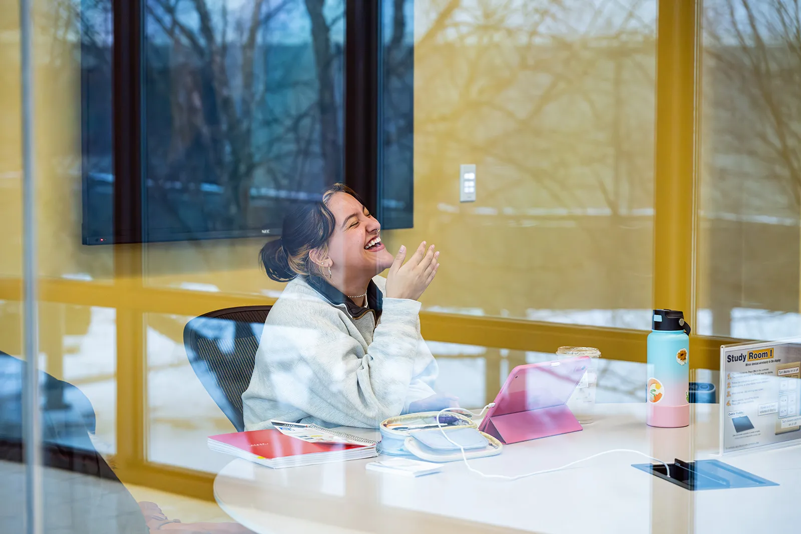 Capturing one of our students studying in the library study rooms, which have big windows to the hallway.