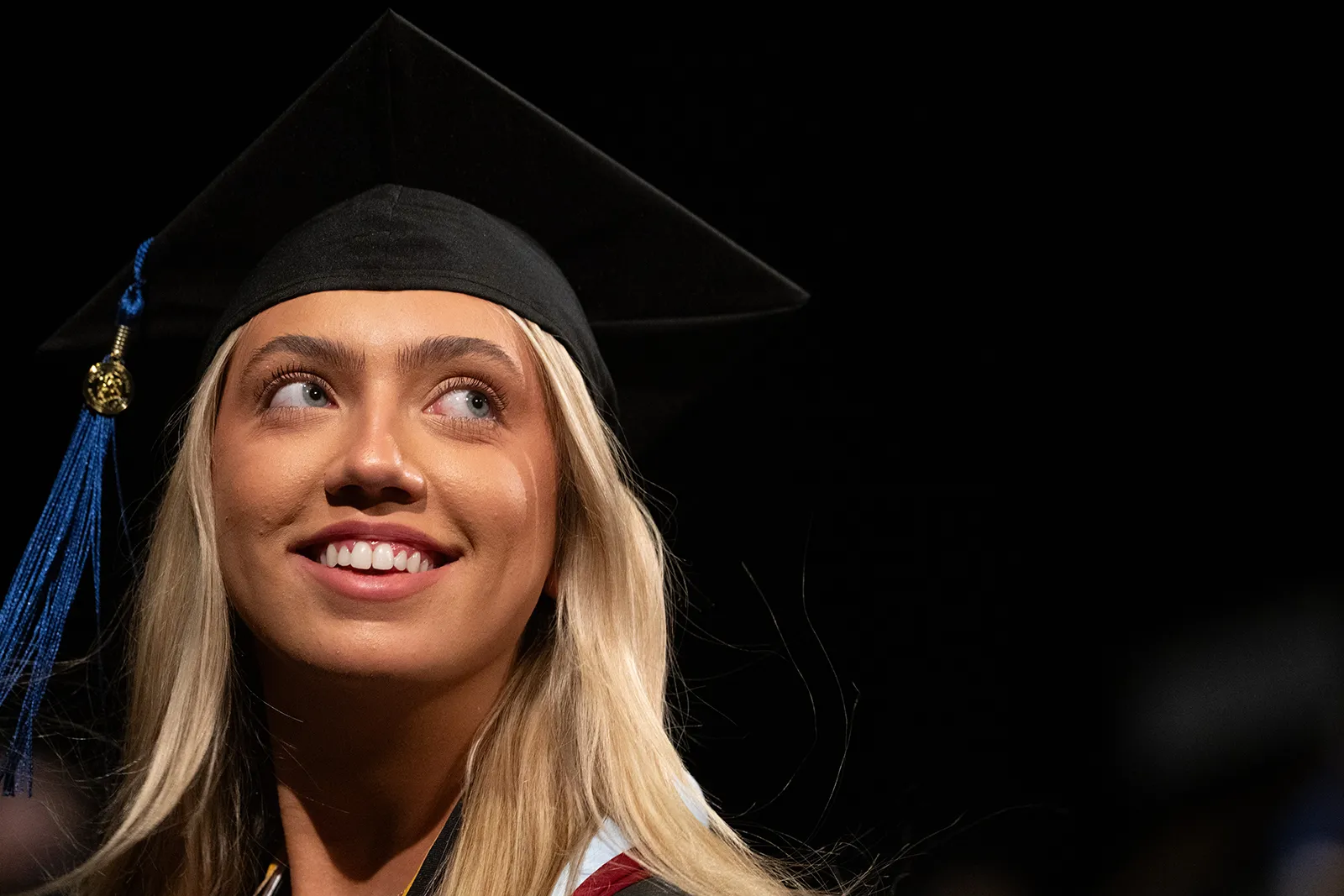 A Tippie College of Business graduate looks back to the audience as she crosses the stage after receiving her diploma.