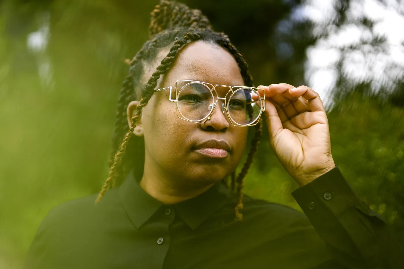 Karmisha Reeb, an Air Force Veteran and PhD student in the college of arts media and design, poses for a portrait.