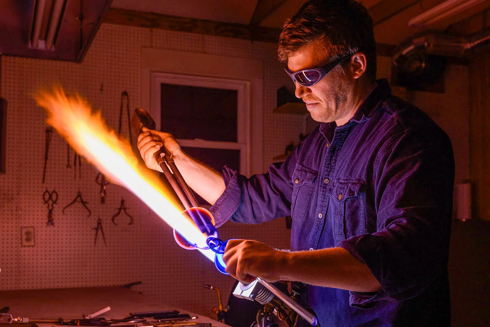 I suppose it's a sign you enjoy your work when you do it after work, too. Kiva Ford, the university's only scientific glass maker, works on a personal project in his home workshop.