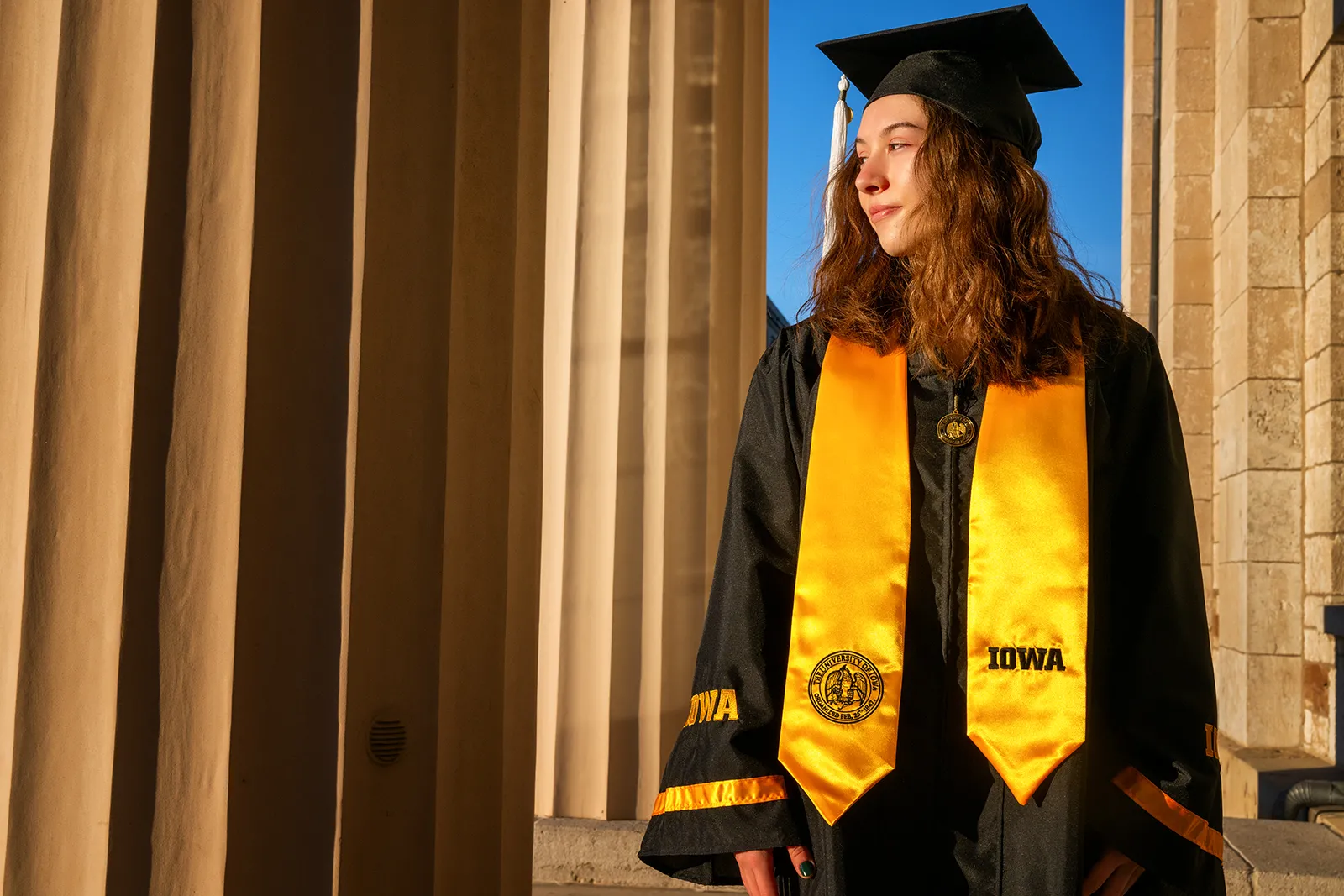 A model graduate shows off the new graduation regalia on the Old Capitol steps.