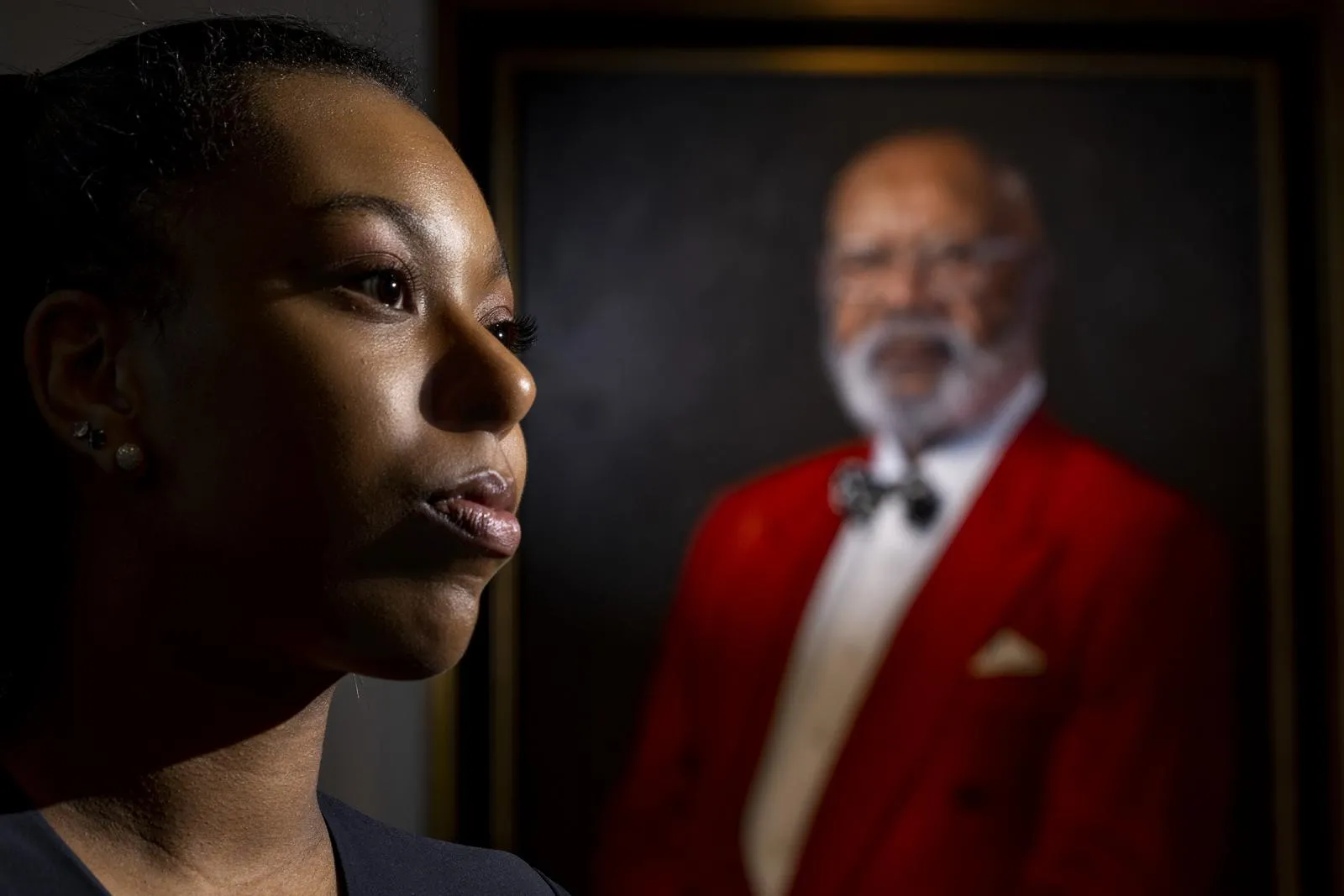 Graduating senior Haley Rose next to a painted portrait of her grandfather, Harold Black. Black was the first African-American graduate of UGA's business school, and was the commencement speaker at Haley's commencement ceremony.