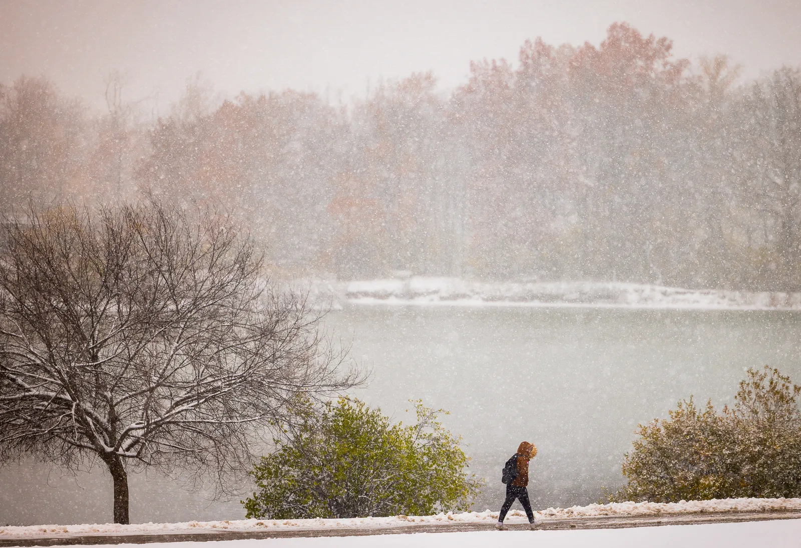 A person walks by Lake La Salle on the morning of the first snow of the season in mid November 2025.