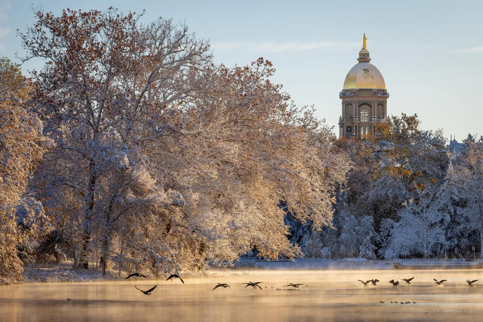 Geese land in Saint Marys Lake near as snow covers trees with the Dome visible.