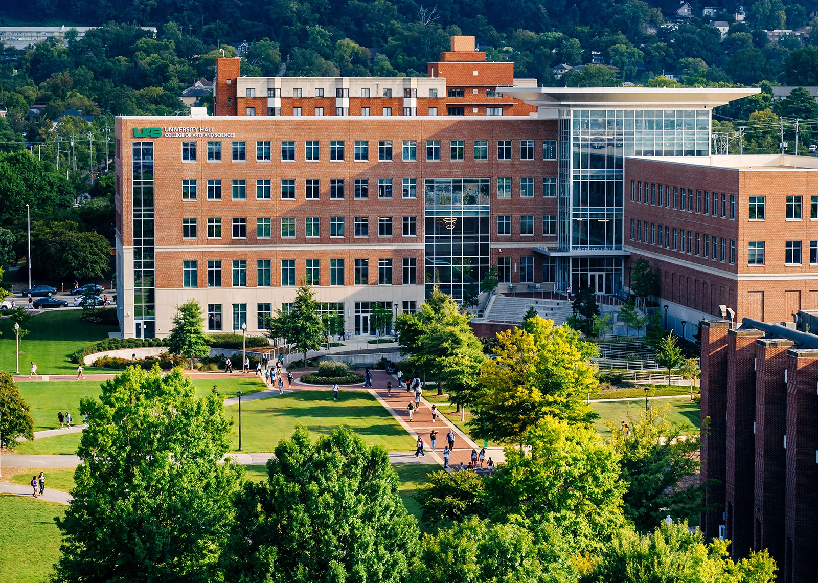 University Hall, surrounded by green. Grass has been retouched.