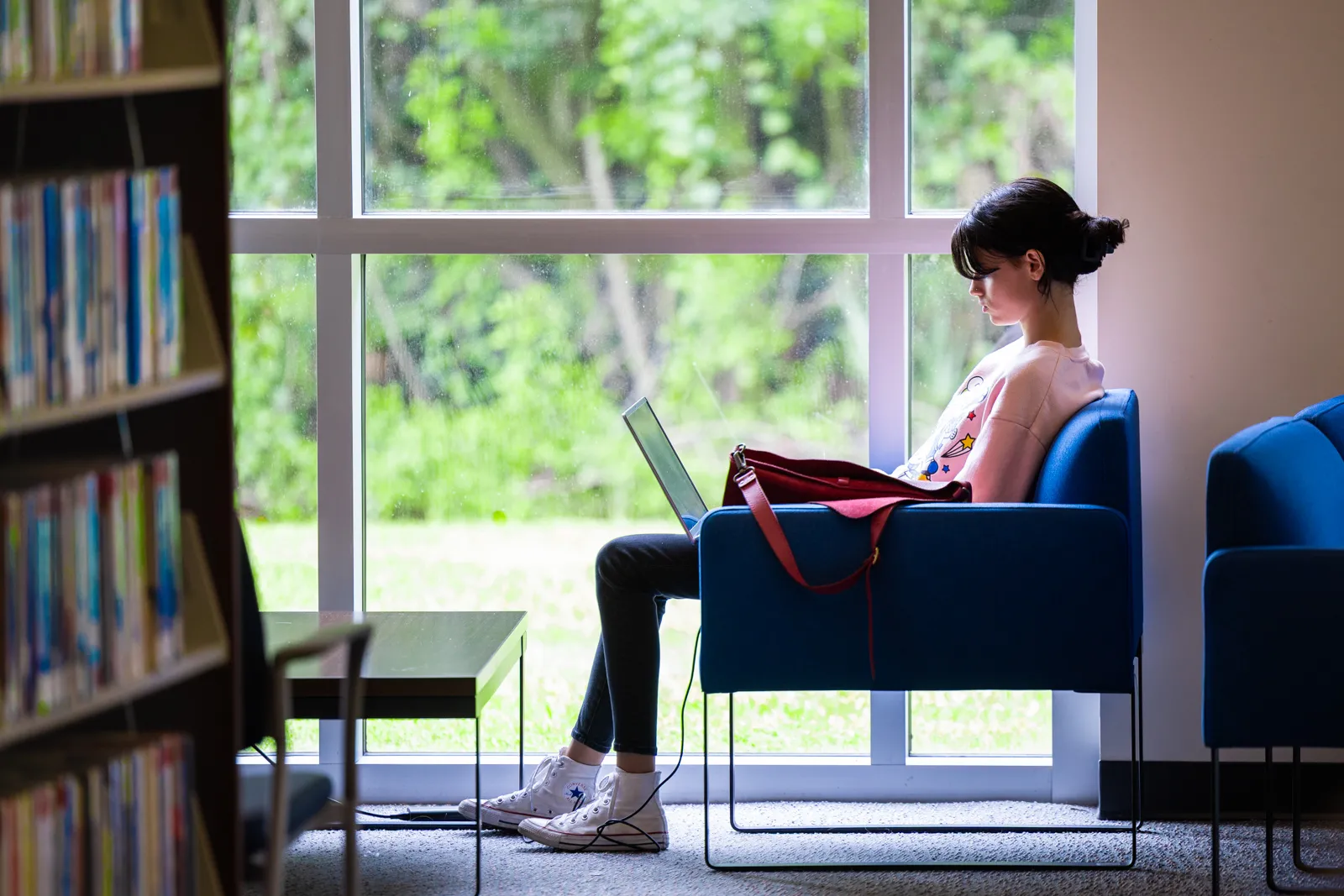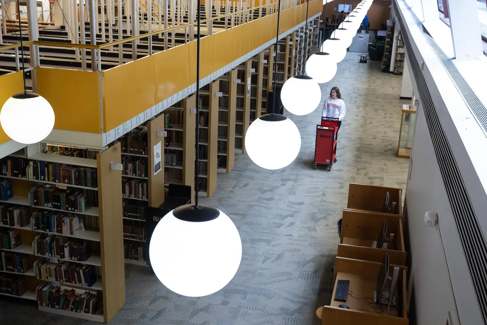 Yeva Zvonar (SAS ’28) shelves books in the Mabel Smith Douglass Library.