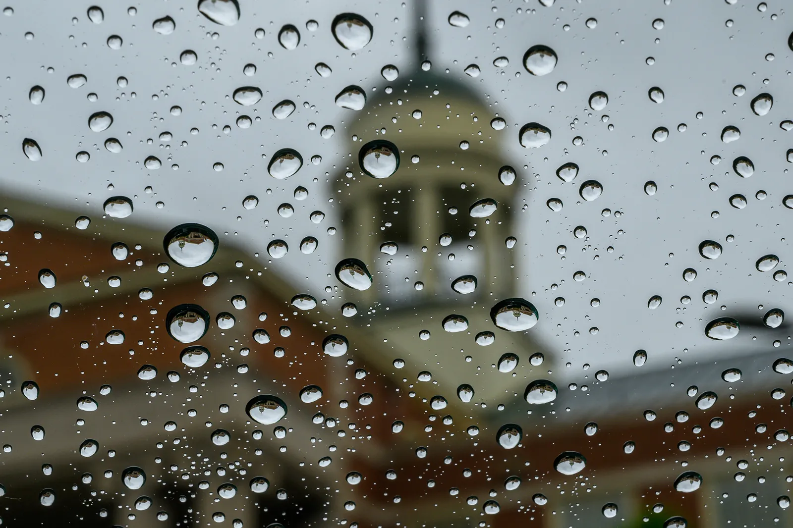 The cupola of the library can be seen reflected in raindrops on a windshield on a rainy Thursday morning in September.