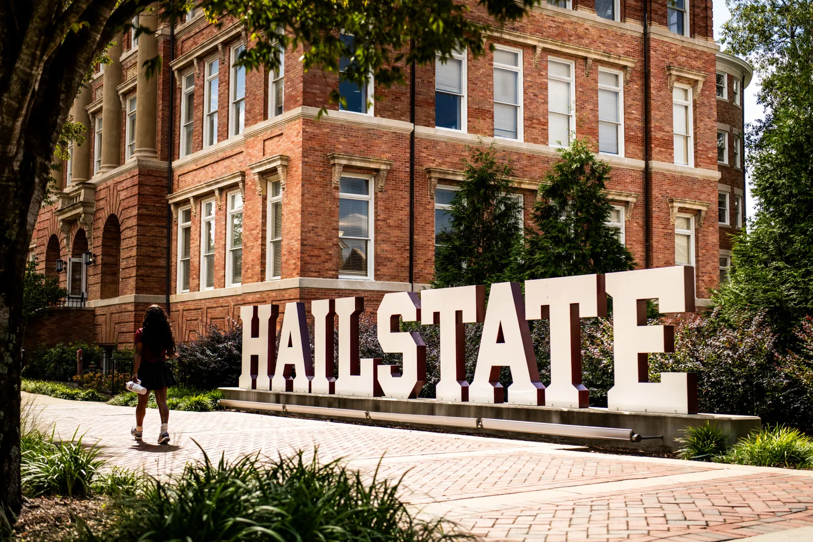 A student passes MSU's iconic Hail State sign while making her way to Montgomery Hall.