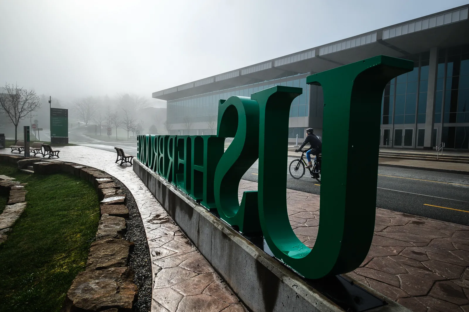 A cyclist arrive on campus in an early foggy morning