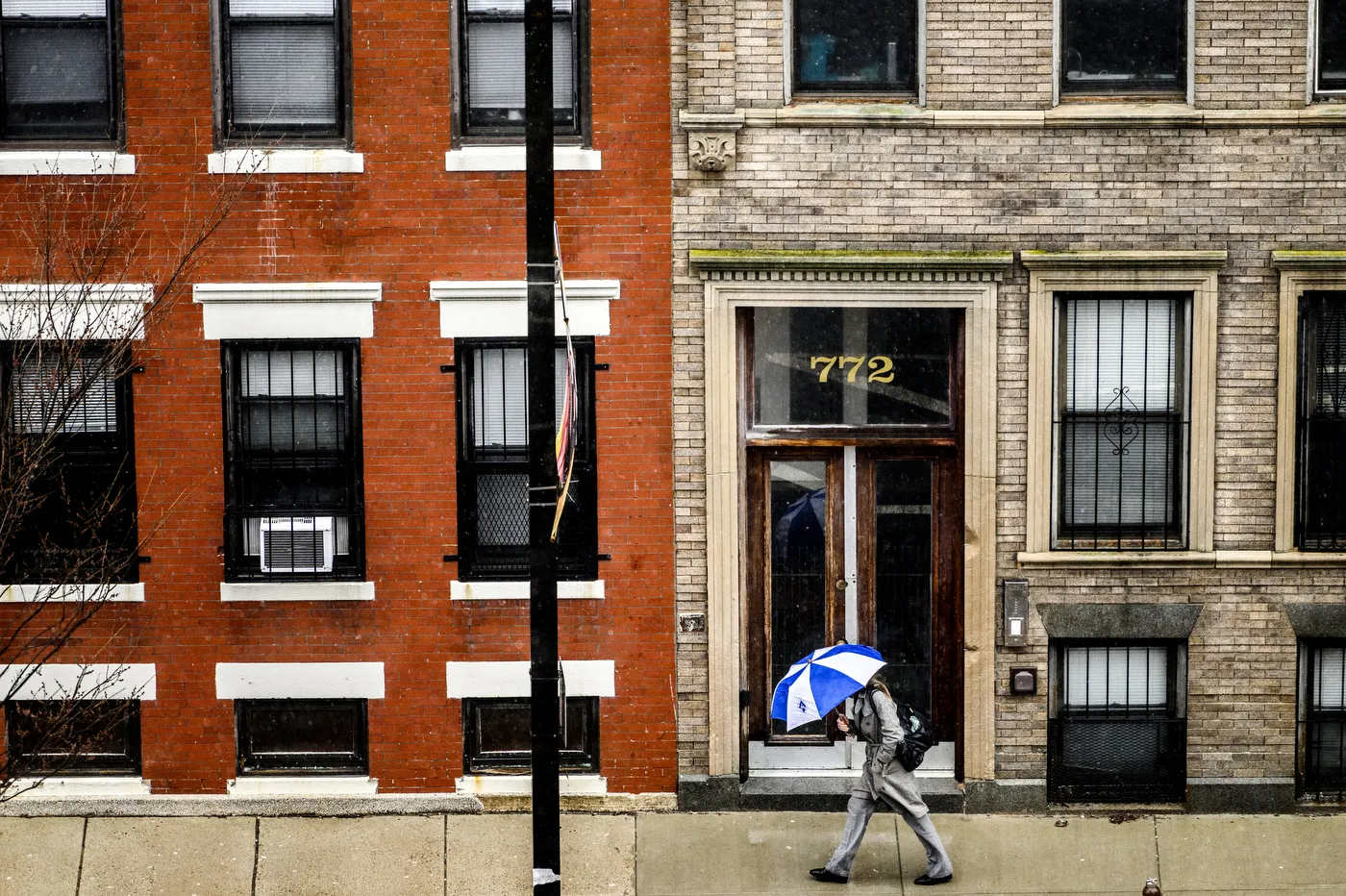 A member of the community walks though campus during a Nor’easter on March. 14, 2023