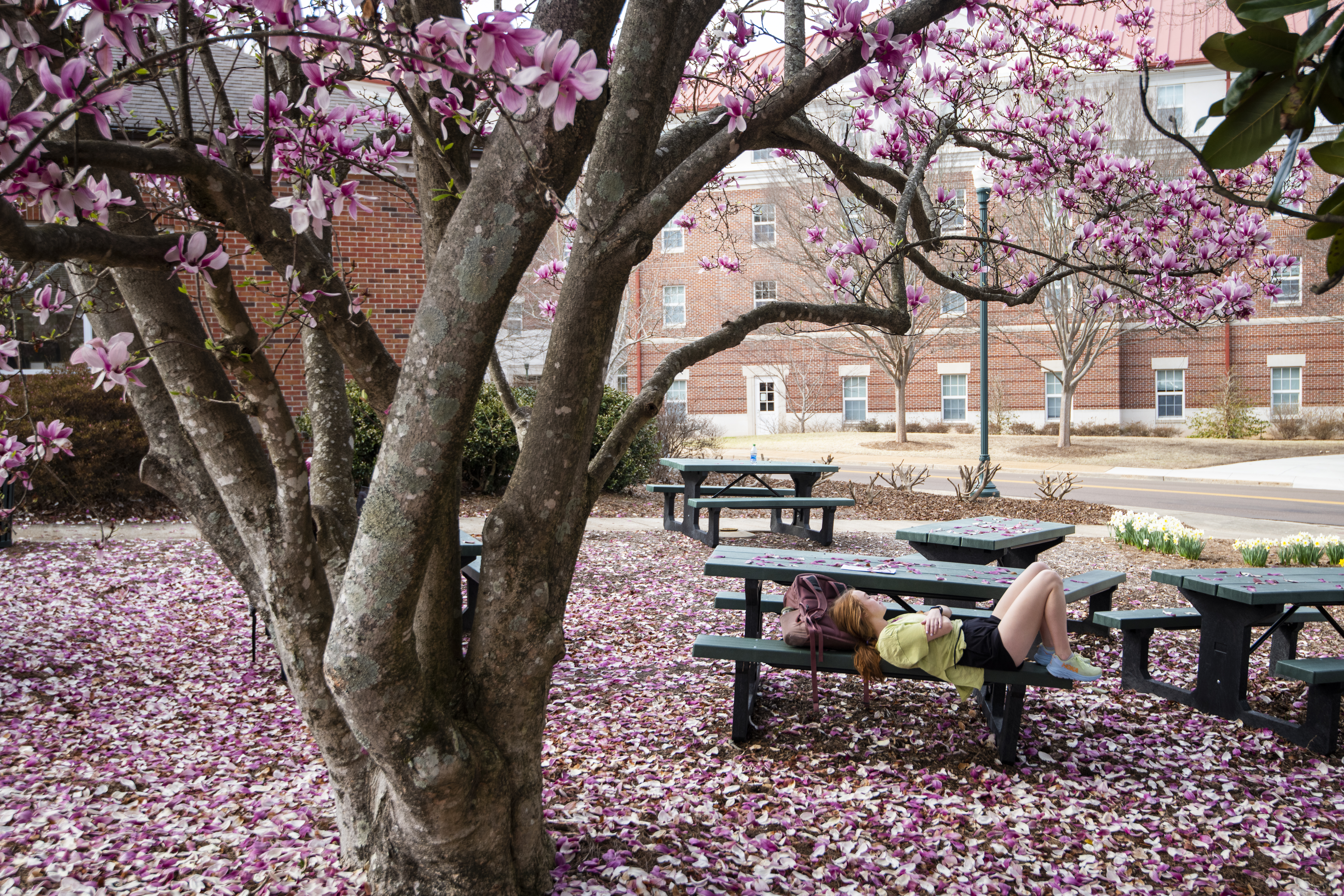 A student at The University of Mississippi naps under a Japanese Magnolia tree.