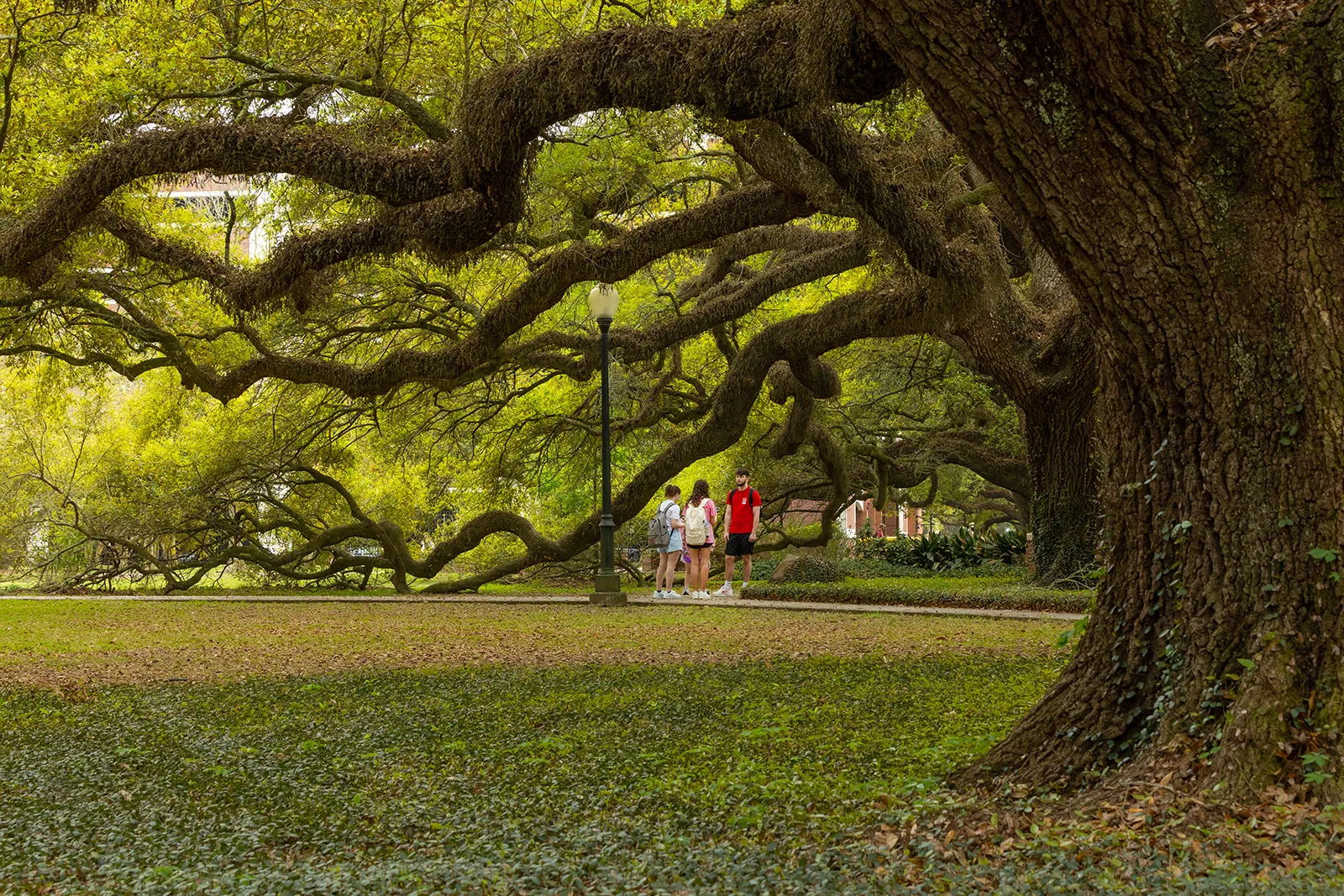 There is that time in spring when leaves just start sprouting and they have that lime yellow tint and a surreal atmosphere is created. This is that time and this is the spot with students unaware in this fantasy environment.