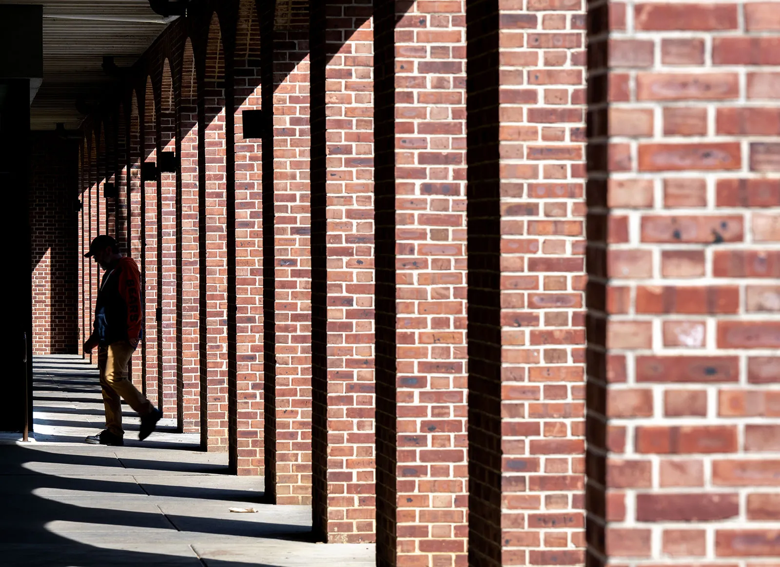 A student walks through the arches toward the dining hall.