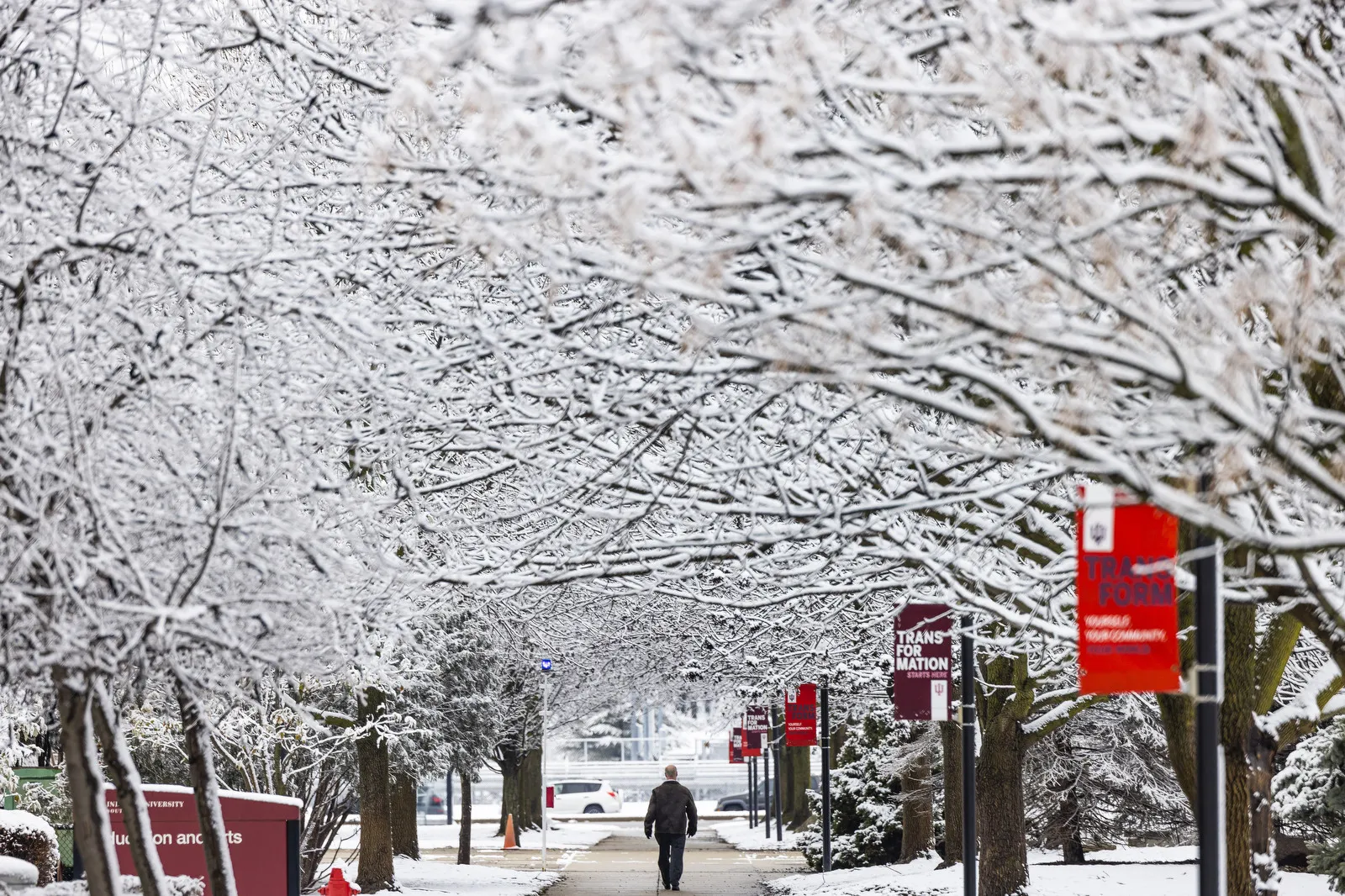 Snow covers trees as a person walks on a sidewalk Friday, March 10, 2023 on campus at IUSB in South Bend, Ind.