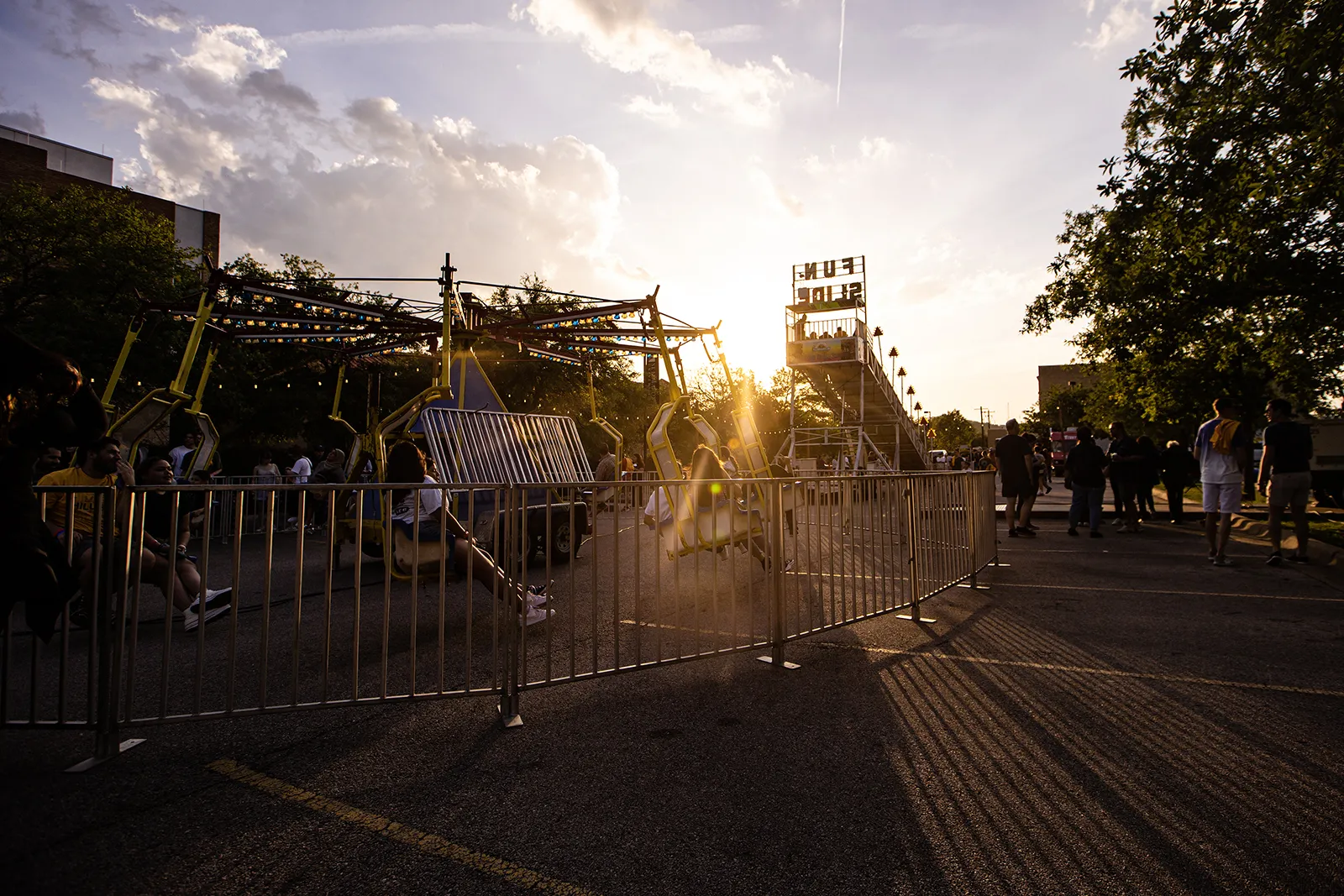 Carnival rides are partially silhouetted against the sunset at Hillfest in Austin, Texas, on Friday, March 31, 2023.