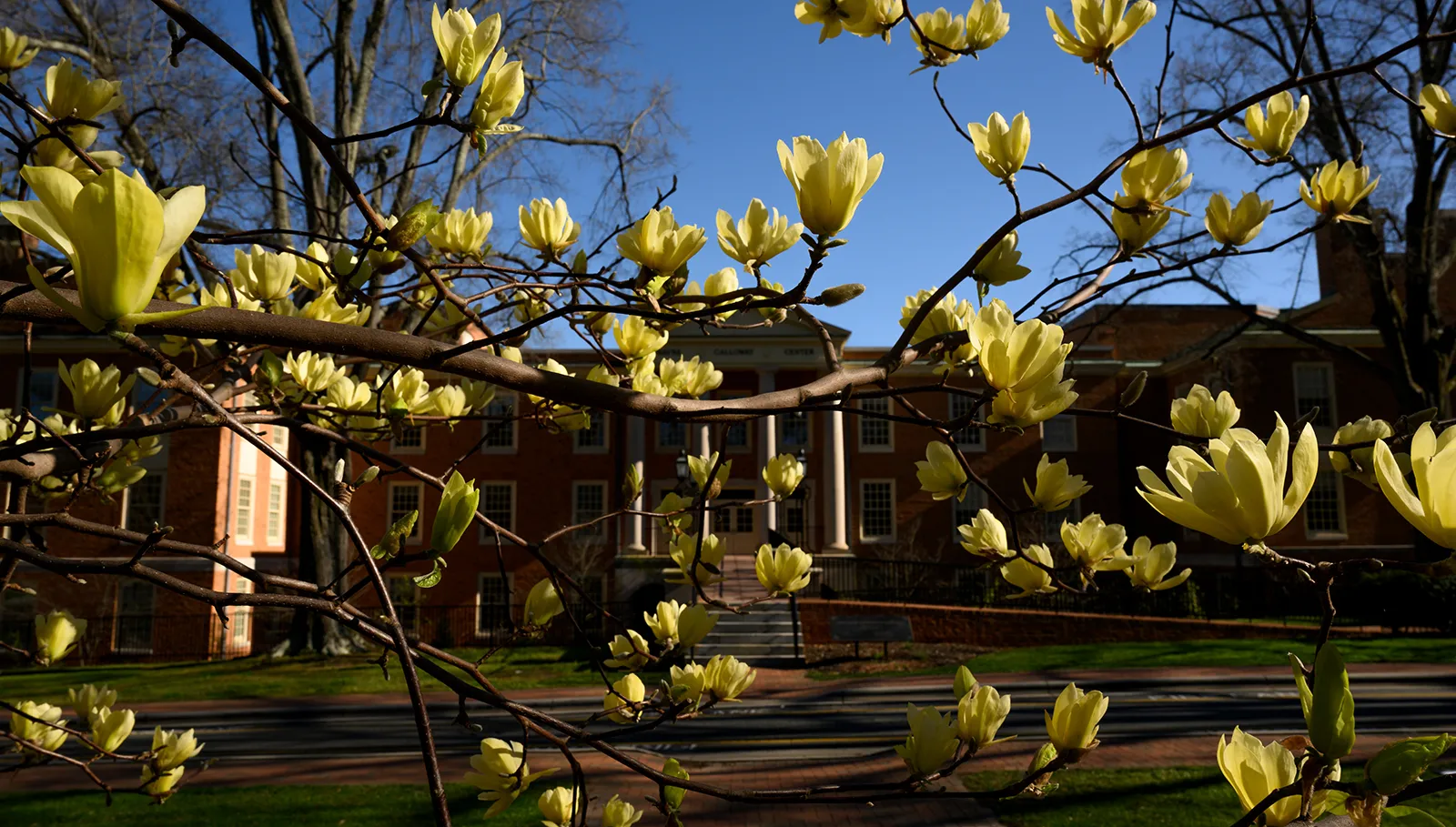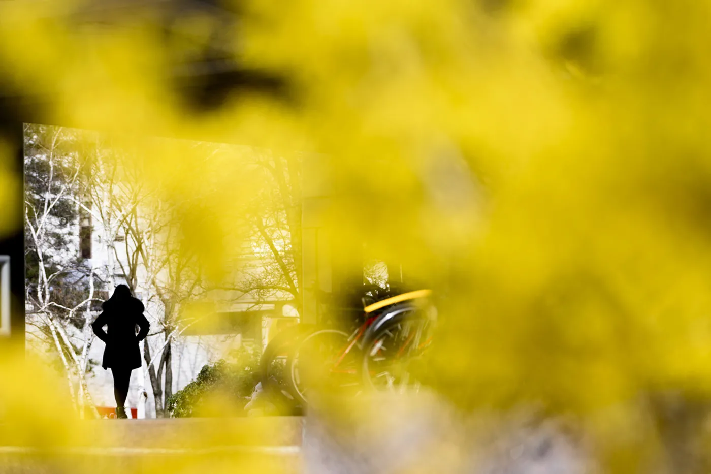 A student framed by hamamelis virginiana, commonly known as witch-hazel, walks through campus.