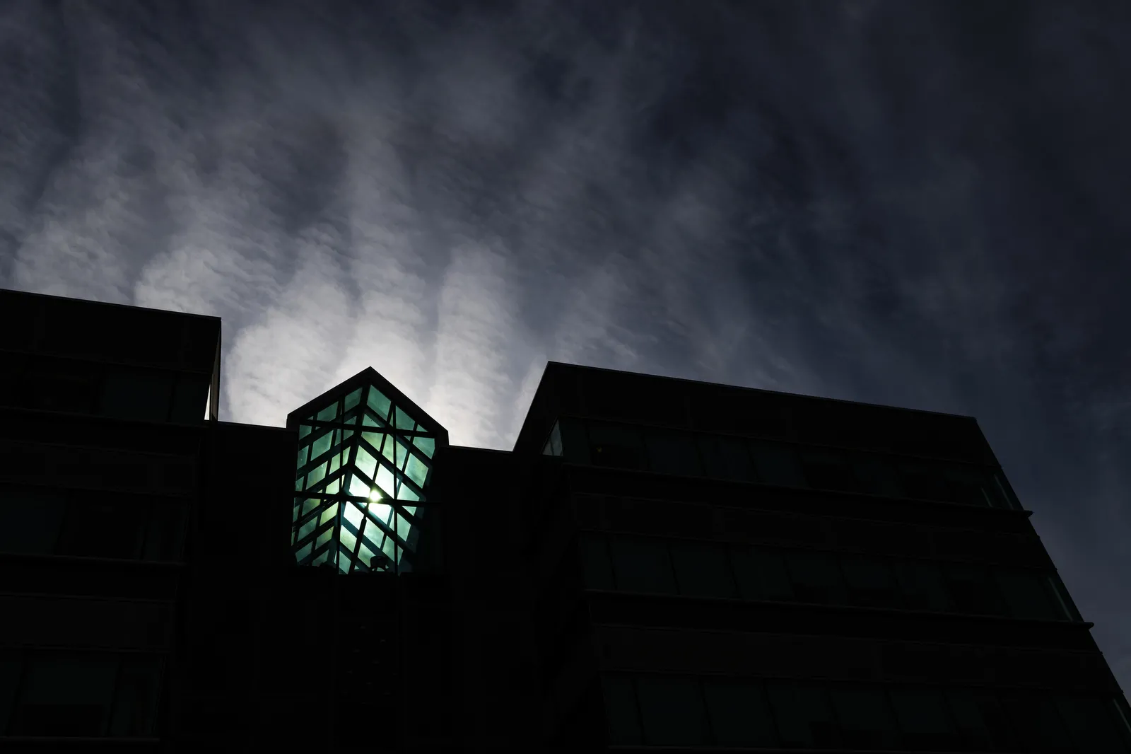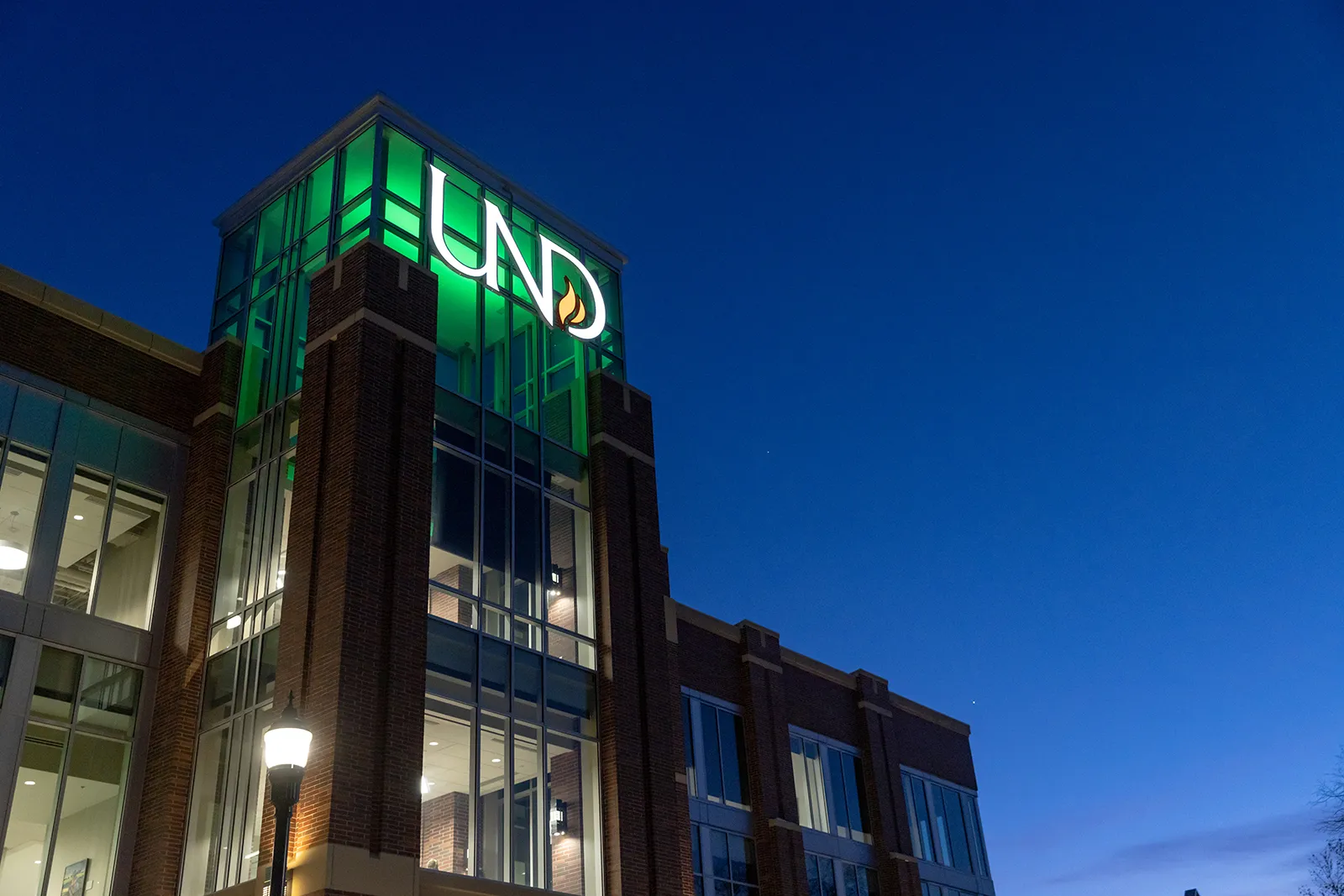The Memorial Union at the University of North Dakota at dusk lit with the school colors.